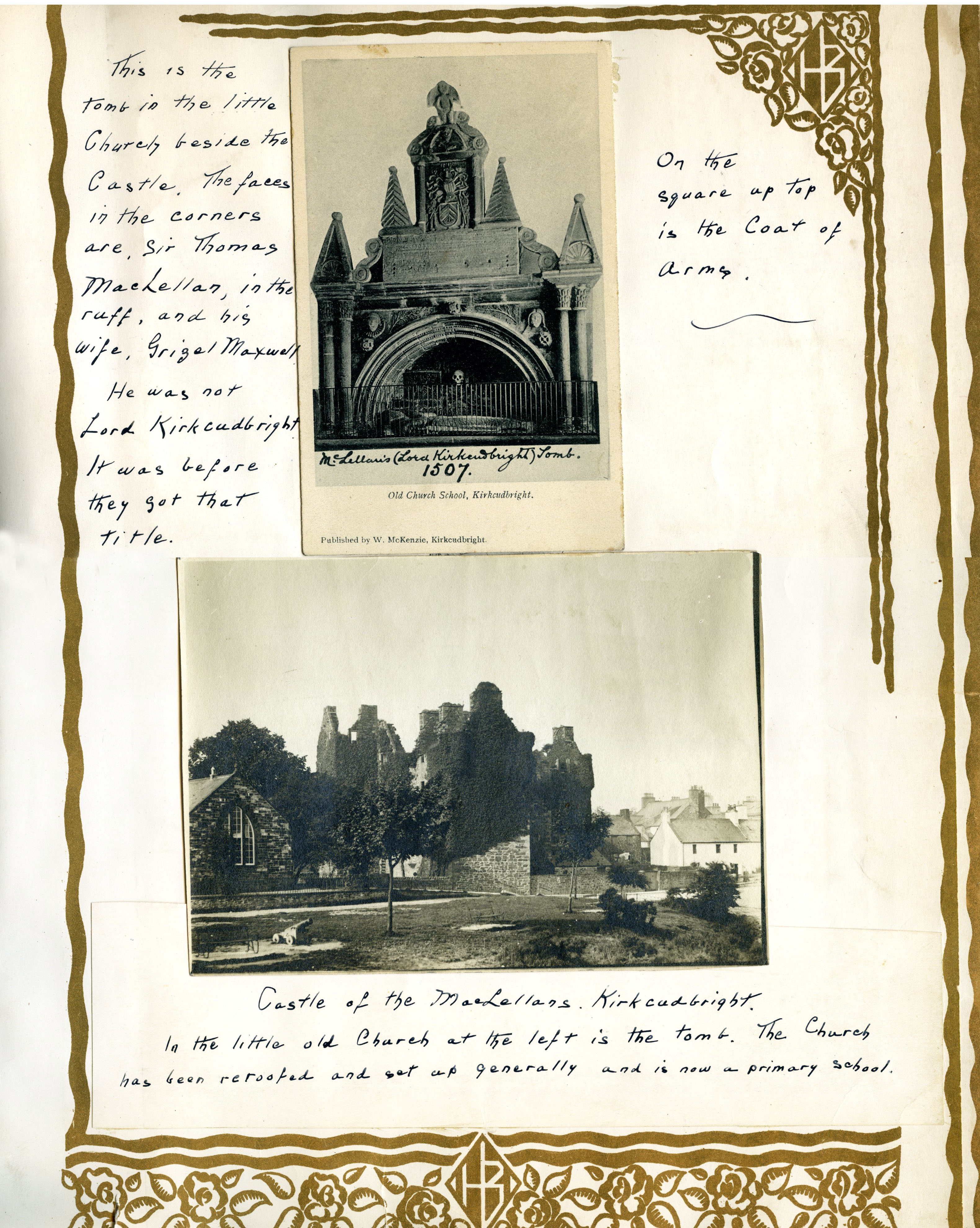 Castle of the MacLellans. Kirkcudbright. In the little old church at the left is the tomb. The Church has been refoofed and set up generally and is now a primary school.