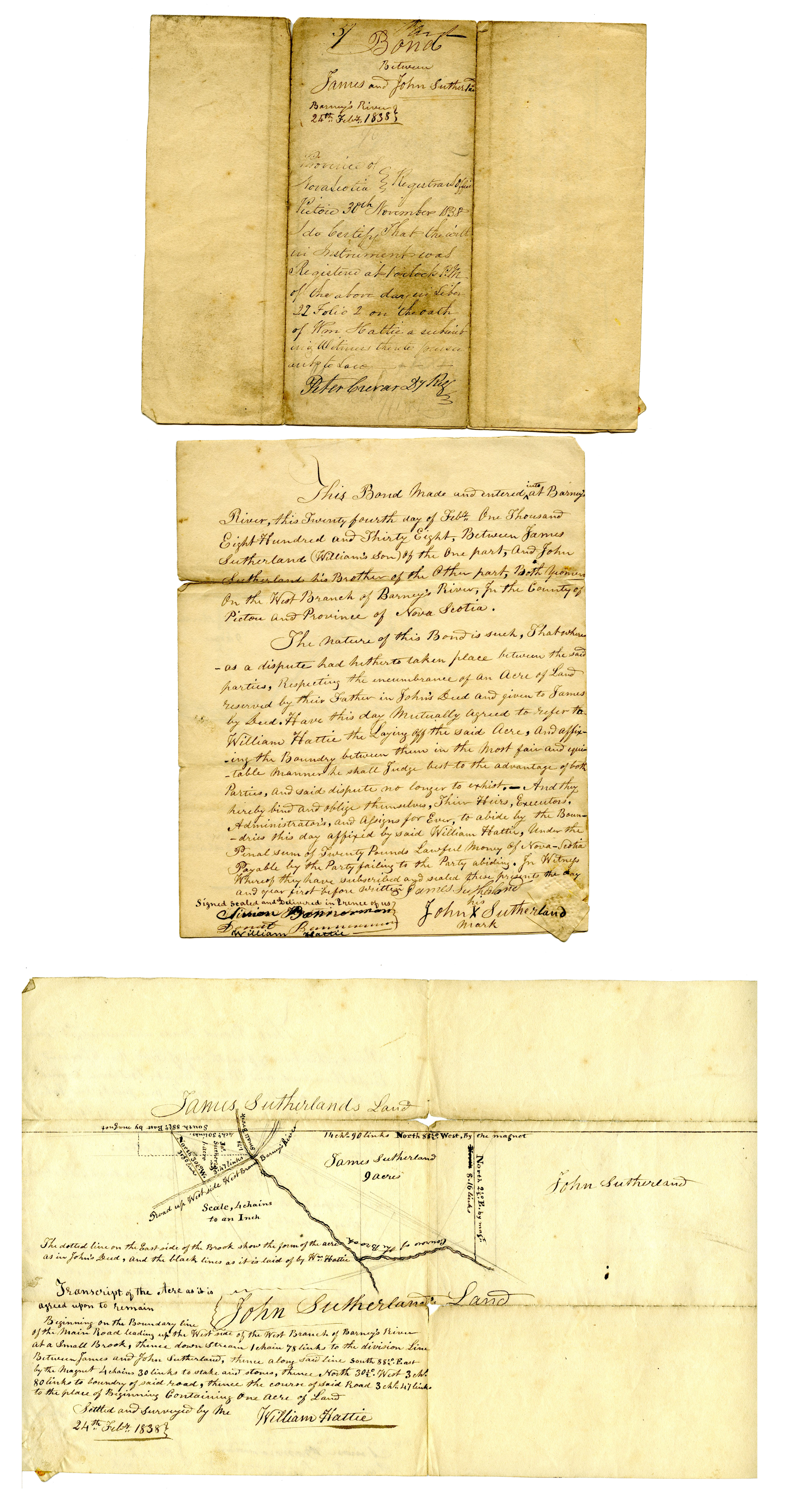 This Bone made and entered into at Barney's River, this Twenty fourth day of February One Thousand Eight Hundred and Thirty Eight, Between James Sutherland (William's son) of the one part, and John Sutherland his Brother of the other part, Both yeoman on the West Branch of Barney's River, for the County of Pictou and Province of Nova Scotia.