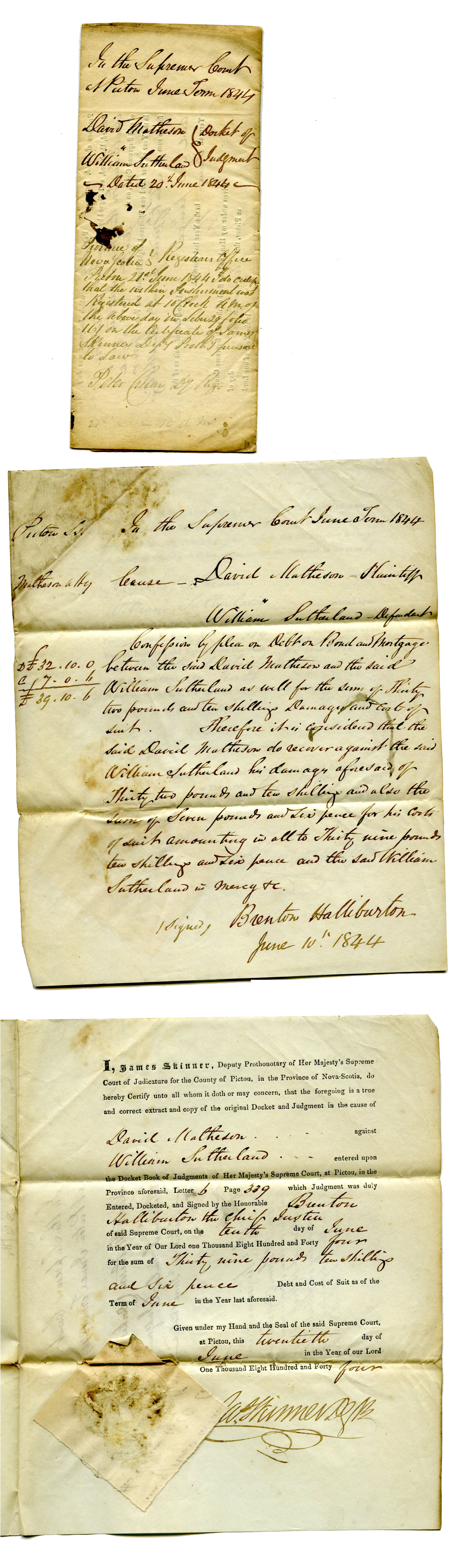 I, James Skinner, Deputy Prothonotary of Her Majesty's Supreme Court of Judicature for the County of Pictou, in the Province of Nova Scotia, do hereby Certify unto all whom it doth or may concern, that the foregoing is a true and correct extract and copy of the original Docket and Judgement in the cause of David Matheson against William Sutherland entered upon the Docket Book of Judgments of Her Majesty's Supreme Court, at Pictou, in the Province aforesaid, Letter b Page 339 which Judgment was duly Entered, Docketed, and Signed by the Honorable Brenton Halliburton the chief Justice of said Supreme Court, on the tenth day of June in the Year of Our Lord one Thousand Eight Hundred and Forty four for the sum of Thirty nine pounds ten shillings and six pence Debt and Cost of Suit as of the Term of June in the Year last aforesaid.