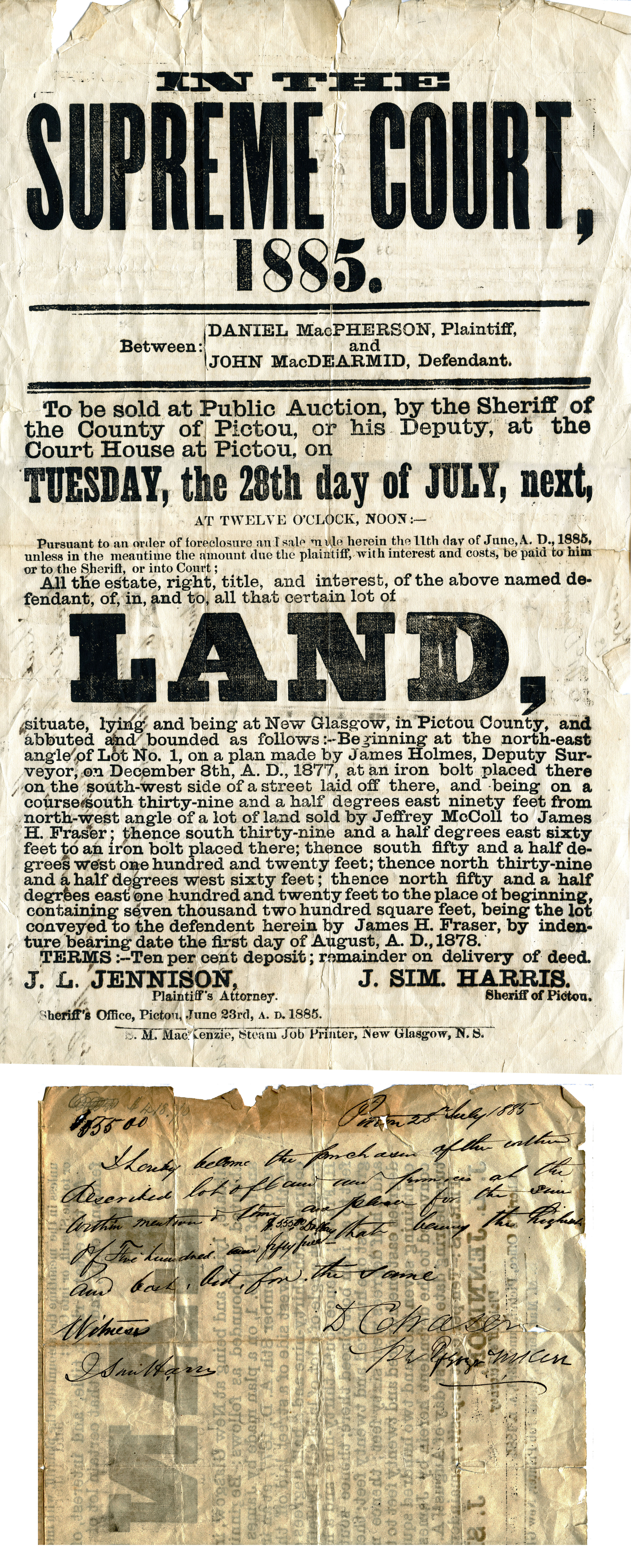 | Tags: | Daniel MacPherson, John MacDearmid, New Glasgow, Pictou County, foreclosure, 1885, Pictou Supreme Court, J. Sim. Harris, L. J. Jennison, land sale, James H. Fraser, Jeffrey McColl, S. M. MacKenzie, Steam Job Printer |