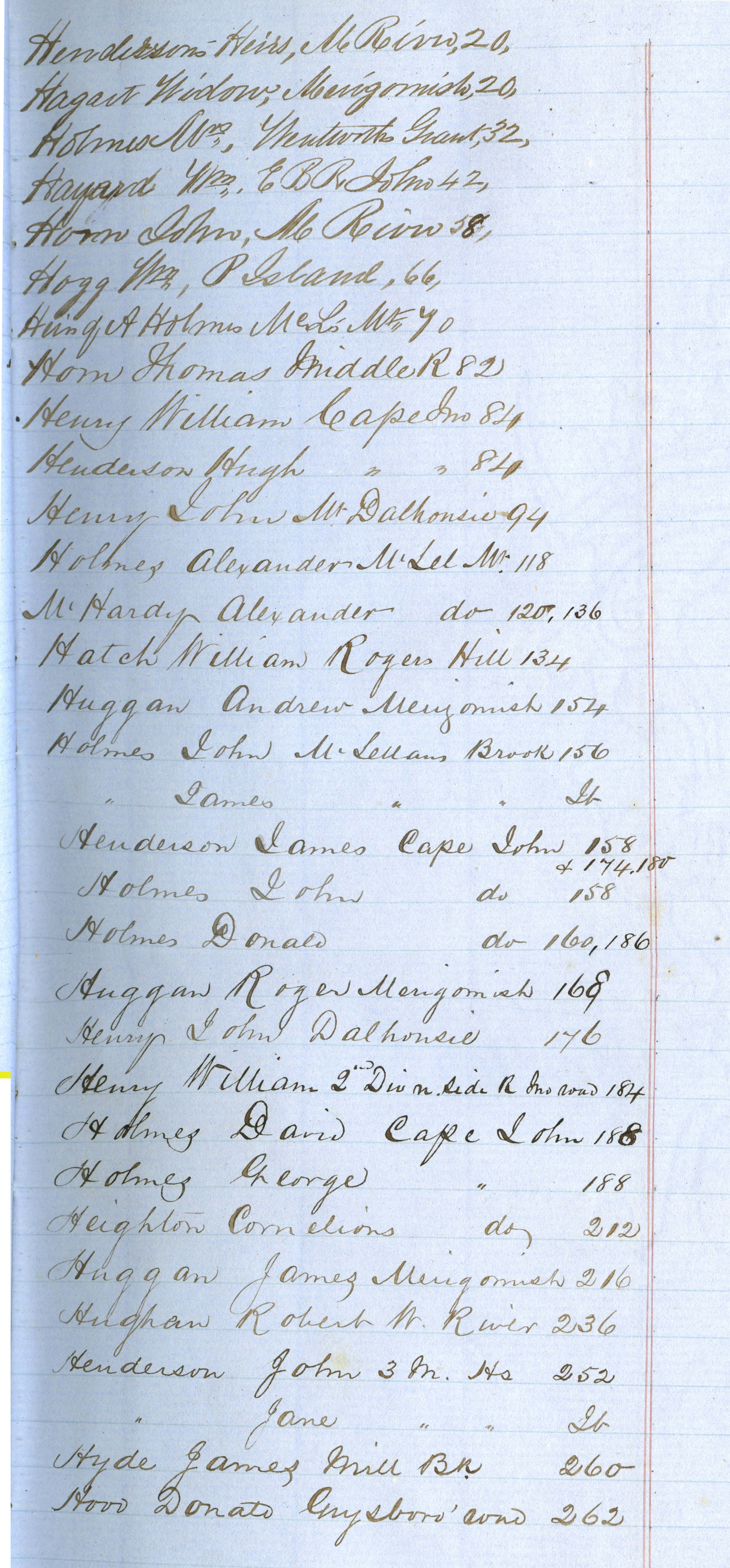 | Tags: | Heirs of Henderson, Widow Hagart, Mrs Holmes, William Hayward, John Horn, William Hogg, Heirs of Holmes, Thomas Horn, William Henry, Hugh Henderson, John Henry, Alexander Holmes, Alexander McHardy, William Hatch, Andrew Huggan, John Holmes, James Holmes, James Henderson, Donald Holmes, Roger Huggan, David Holmes, George Holmes, Cornelious Heighton, James Huggan, Robert Hughan, John Henderson, Jane Henderson, James Hyde, Donald Hood, roads, Pictou County roads, road maintenance, road damages |