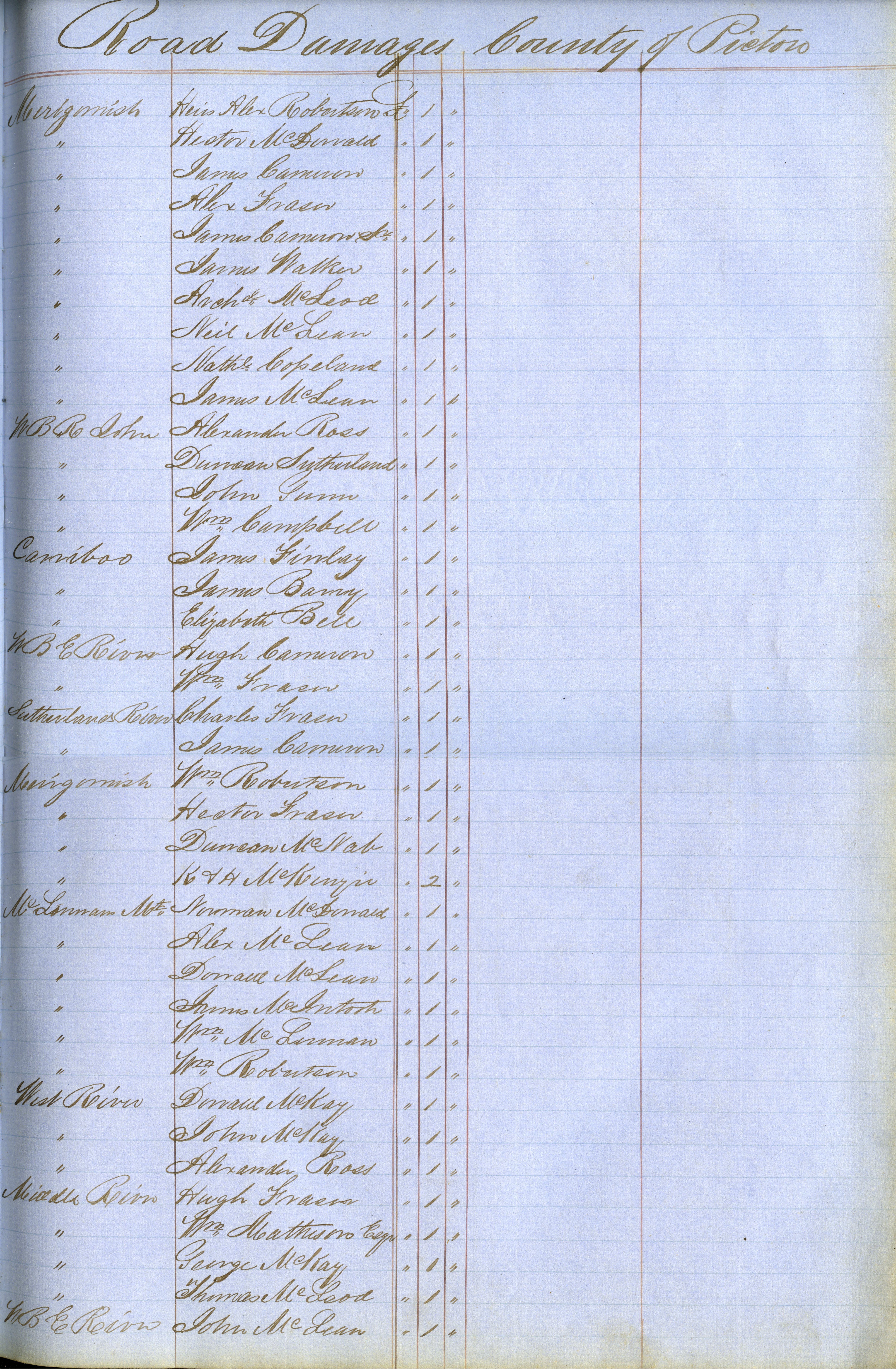 , Alexander Robertson, Merigomish, Hector McDonald, James Cameron, Alexander Fraser, James Walker, Archibald McLeod, Neil McLean, Nathaniel Copeland, James McLean, West Branch River John, Alexander Ross, Duncan Sutherland, John Gunn, William Campbell, Carriboo, James Finlay, James Barry, Elizabeth Bell, West Branch East River, Hugh Cameron, William Fraser, Sutherlands River, Charles Fraser, William Robertson, Hector Fraser, Duncan McNab, K & H McKenzie, McLennans Mountain, Norman McDonald, Alexander McLean, Donald McLean, James McIntosh, William McLennan, West River, Donald McKay, John McKay, Middle River, Hugh Fraser, William Matheson Esquire, George McKay, Thomas McLeod, John McLean |