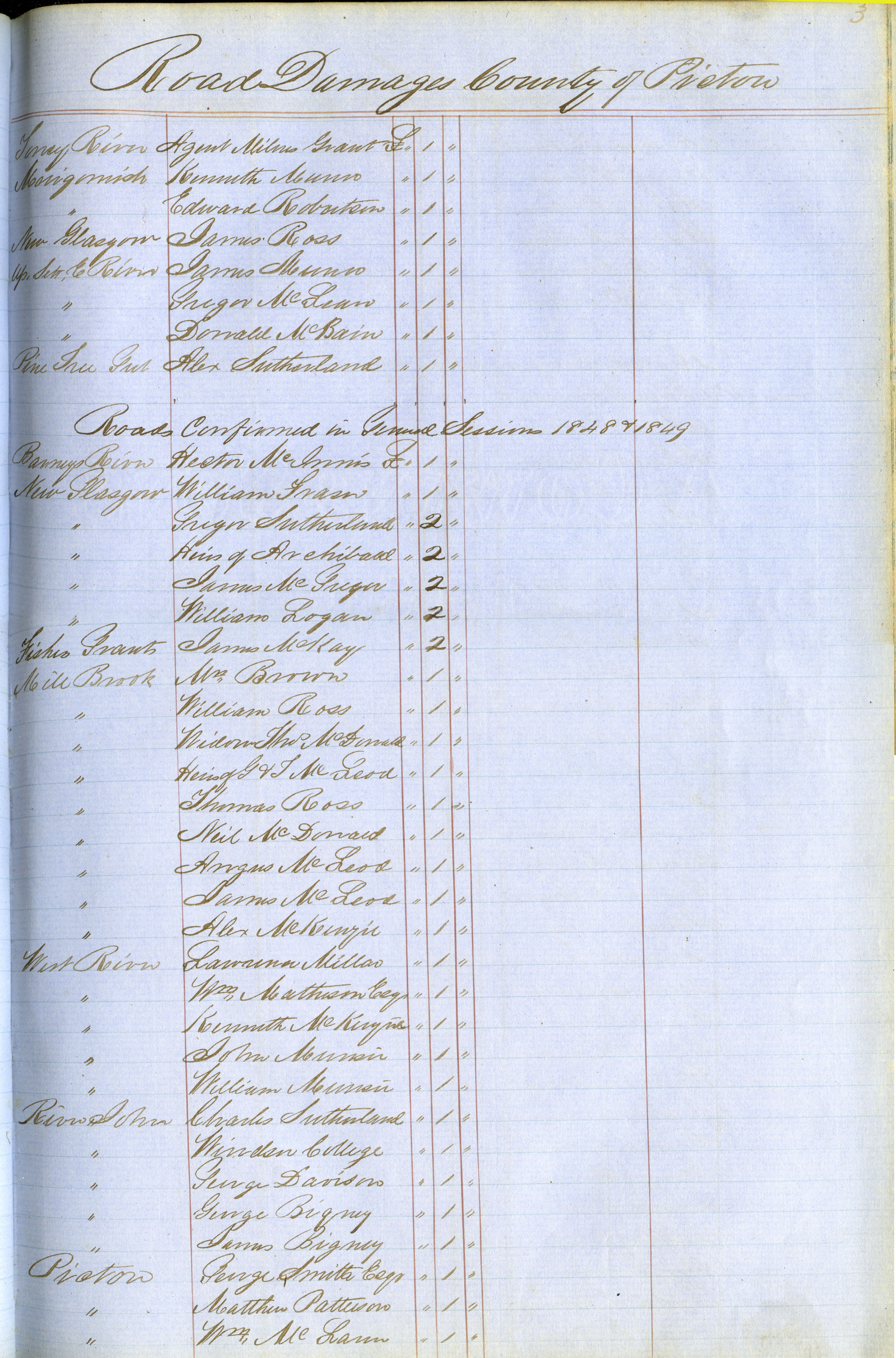 Toney River, Agent Milnes Grant, Merigomish, Kenneth Munro, Edward Robertson, New Glasgow, James Ross, Upper Settlement East River, James Munro, Gregor McLean, Donald McBain, Pine Tree Gut, Alexander Sutherland, 1848, 1849, Barneys River, Hector McInnis, William Fraser, Gregor Sutherland, Heirs of Archibald, James McGregor, William Logan, Fisher Grants, James McKay, Mile Brook, Mrs Brown, William Ross, Widow Thomas McDonald, Heirs of G & T McLeod, Thomas Ross, Neil McDonald, Angus McLeod, James McLeod, Alexander McKenzie, West River, Lawrence Millar, William Matheson Esquire, Kenneth McKenzie, Kenneth McKinzie, John Munsie, William Munsie, River John, Charles Sutherland, Windsor College, George Davison, George Bigney, James Bigney, Pictou, George Smith Esquire, Matthew Patterson, Mathew Patterson, William McLann |