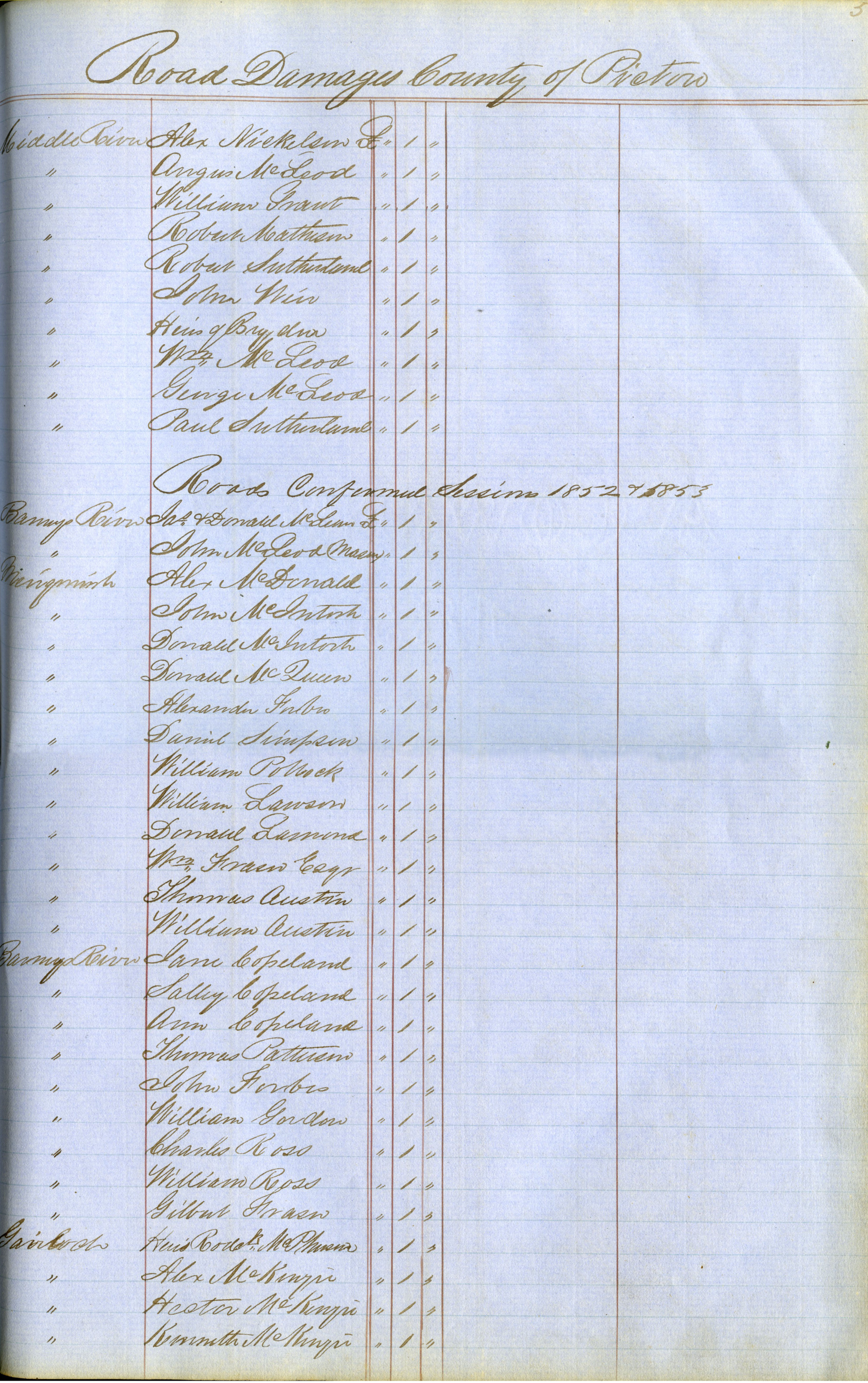 Middle River, Alex Nickelson, Angus McLeod, William Grant, Robert Matheson, Robert Sutherland, John Weir, William McLeod, George McLeod, Paul Sutherland, 1852, 1853, Barneys River, James McLennan, Donald McLellan, John McLeod, Alexander McDonald, Merigomish, John McIntosh, Donald McIntosh, Donald McQueen, Alexander Forbes, Heirs of Bryden, Daniel Simpson, Daniel Simpsen, William Pollock, William Lawson, Donald Lemont, Donald Lamond, William Fraser, Thomas Austin, Jane Copeland, Sally Copeland, Ann Copeland, Thomas Patterson, John Forbes, William Gordon, Charles Ross, William Ross, Gilbert Fraser, Gairloch, Heirs of Roderick McPherson, Alex McKenzie, Hector McKenzie, Kenneth McKenzie |