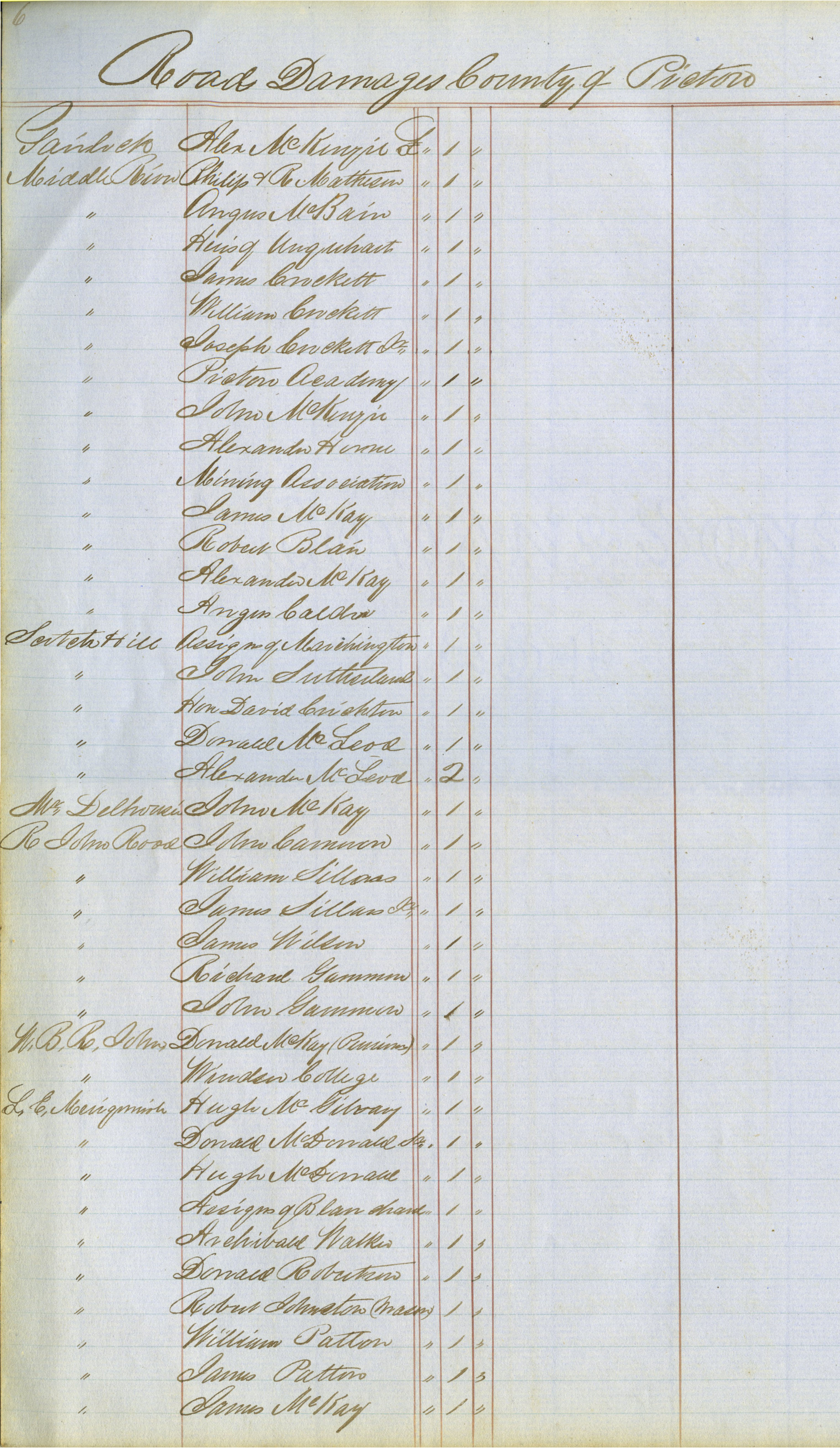 Gairloch, Alexander McKenzie, Middle River, Philip Matheson, R Matheson, Angus McBain, Heirs of Urquhart, James Crockett, William Crockett, Joseph Crockett Junior, Pictou Academy, John McKenzie, Alexander Horne, Middle River Mining Association, James McKay, Robert Blair, Alexander McKay, Angus Calder, Scotch Hill, Assigns of Marchington, John Sutherland, David Crichton, Donald McLeod, Alexander McLeod, John McKay, John Cameron, Mt Dalhousie, River John Road, William Sillars, James Sillars Junior, James Wilson, Richard Gammon, John Gammon, Donald McKay, West Branch River John, Windsor College, Merigomish, Lower East Merigomish, Hugh McGilvray, Donald McDonald Senior, Hugh McDonald, Assigns of Blanchard, Archibald Walker, Donald Robertson, Robert Johnston, William Patton, James Patton, James McKay |