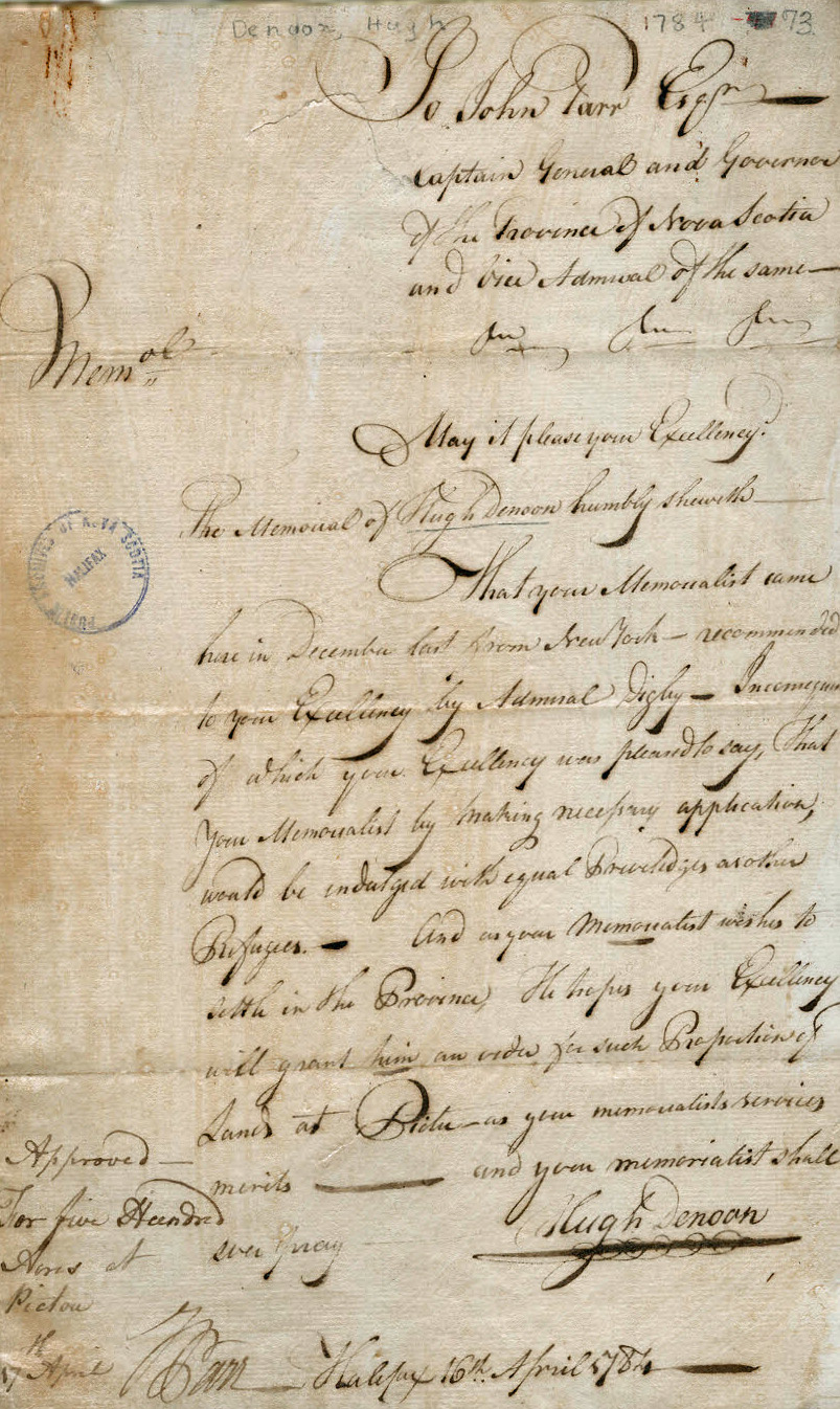Hugh Denoon made application for land in Pictou where he eventually established permanent residence and remained there until his death in 1836.