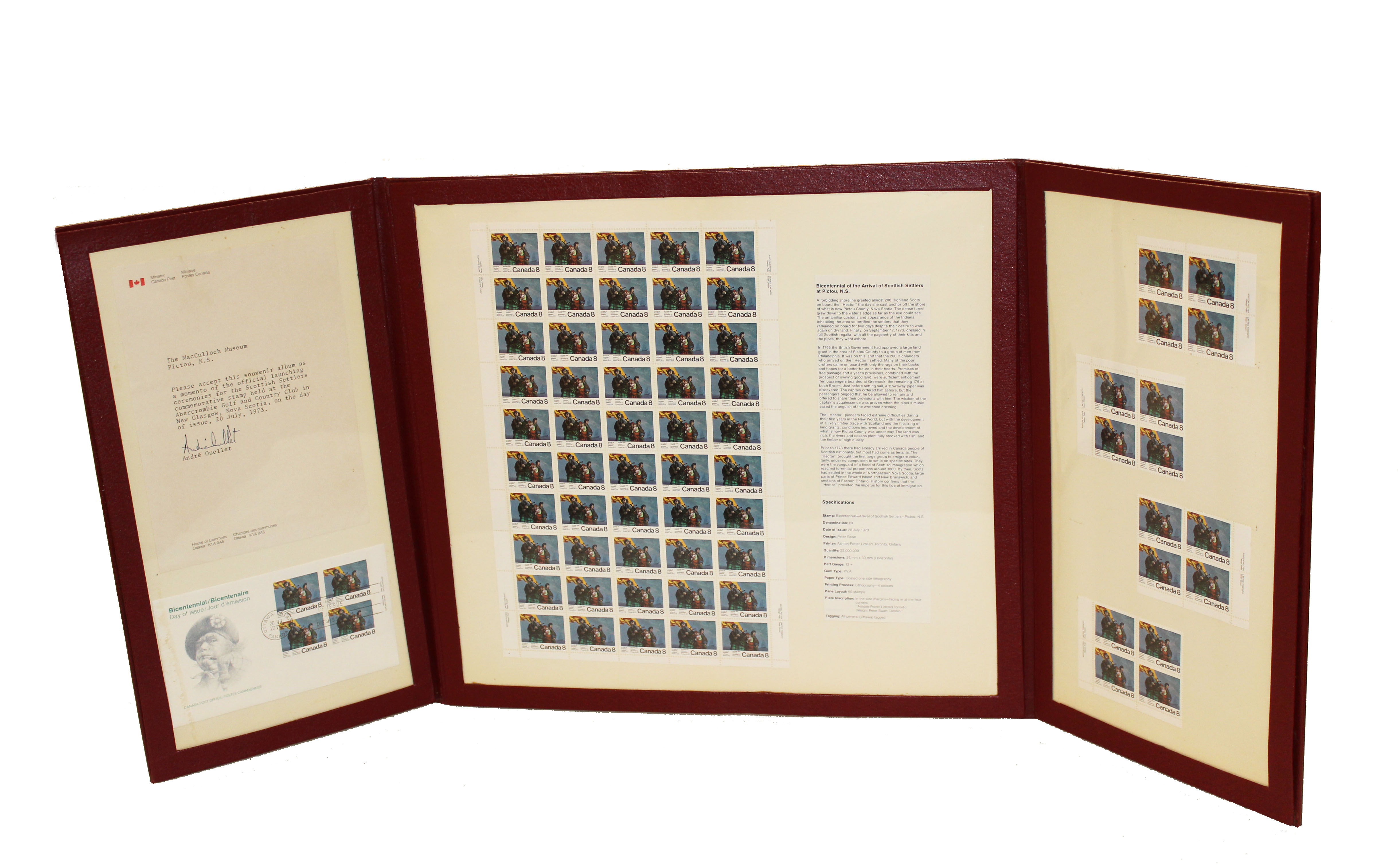 Commemorative stamp album celebrating the bicentennial of the Arrival of Scottish Settlers at Pictou, Nova Scotia. 8¢ stamp issued 20 July 1973. Designed by Peter Swan.