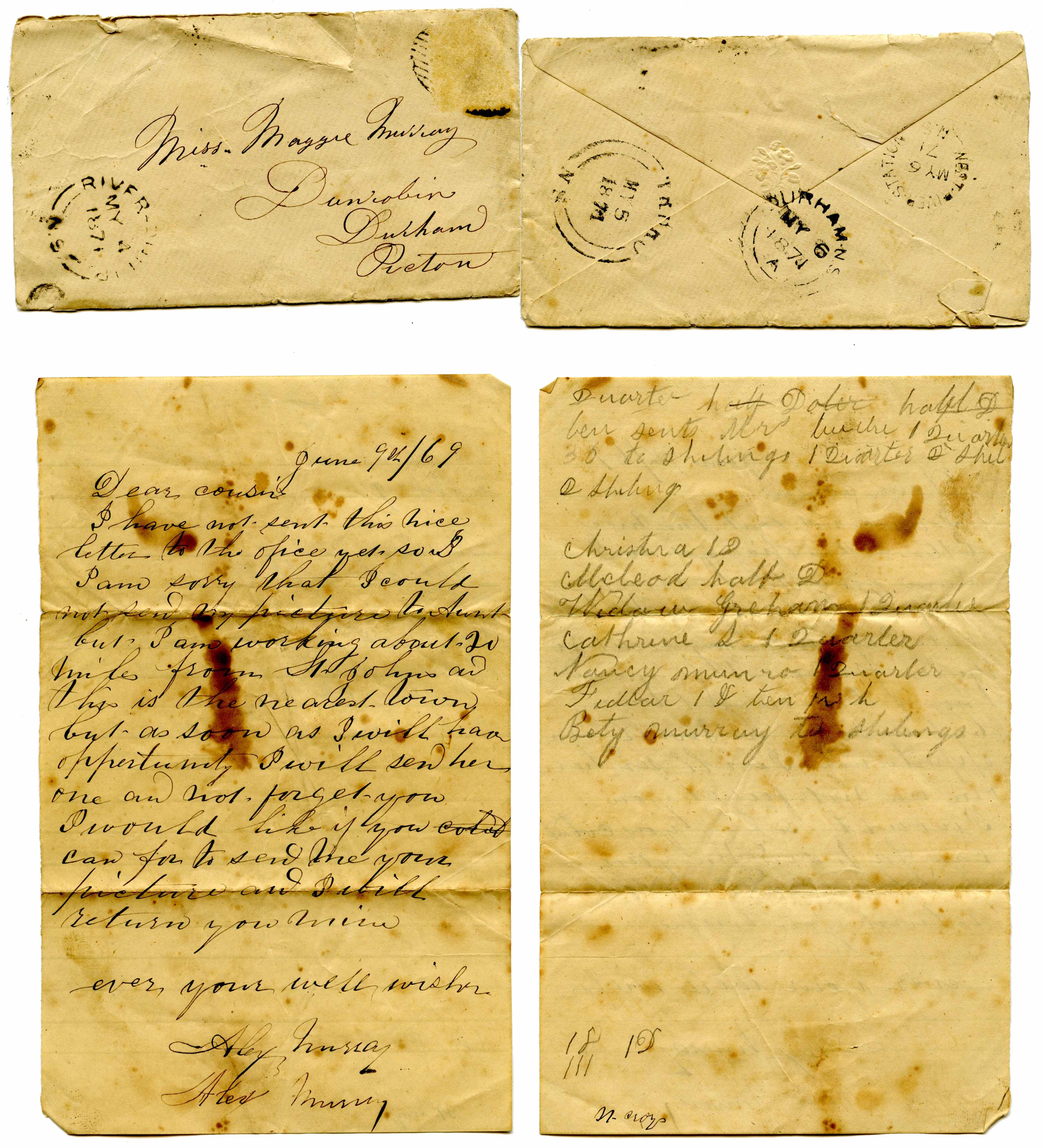 Miss Maggie Murray, Dunrobin, Durham, Pictou (postmarks read River Phillip, May 4, 1871; Truro, May 5, 1871, West River Station, May 6, 1871 and Durham, May 6, 1871)
