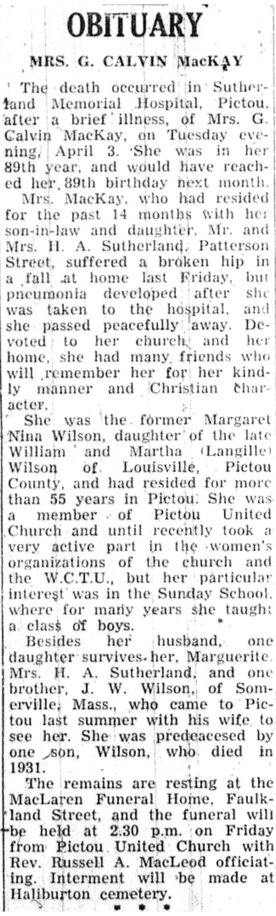She was the former Margaret Nina Wilson, daughter of the late William and Martha (Langille) Wilson of Louisville, Pictou County, and had resided for more than 35 years in Pictou. She was a member of Pictou United Church and until recently took a very active part in the women's organizations of the church and the W.C.T.U., but her particular interest was in the Sunday School, where for many years she taught a class of boys.
