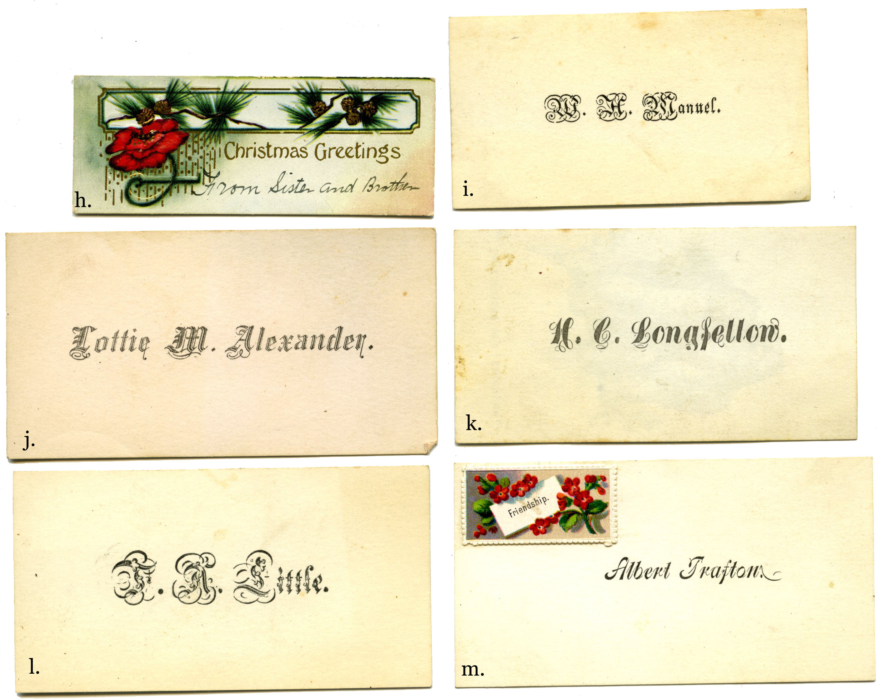 | Tags: | Chrissie McKay, David McKay, 1880, calling cards, Albert Trafton, T A Little, H C Longfellow, Lottie M Alexander, W H Manuel |