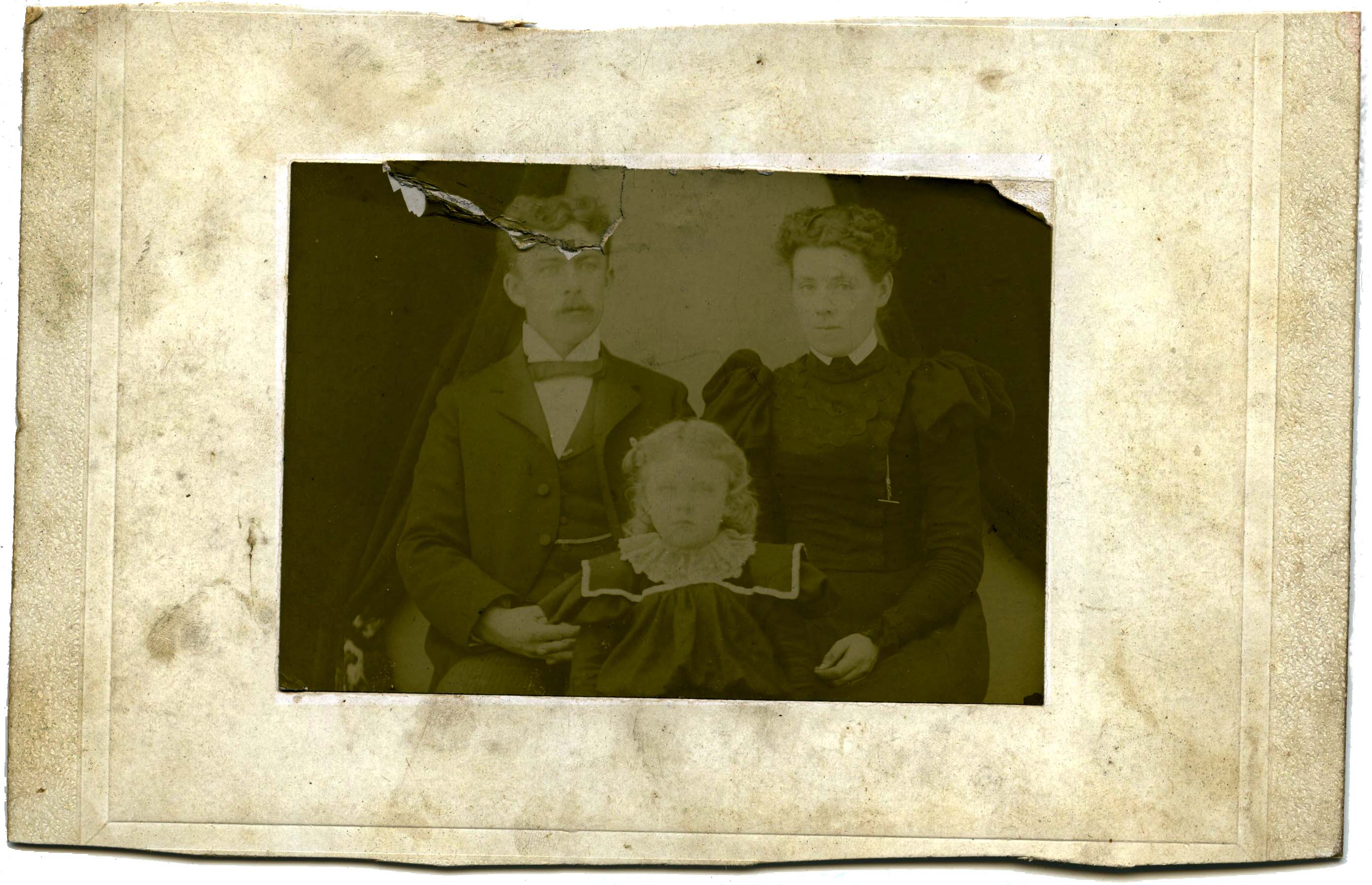 Family photo. Card edges are rough, may have been cut to fit in album.