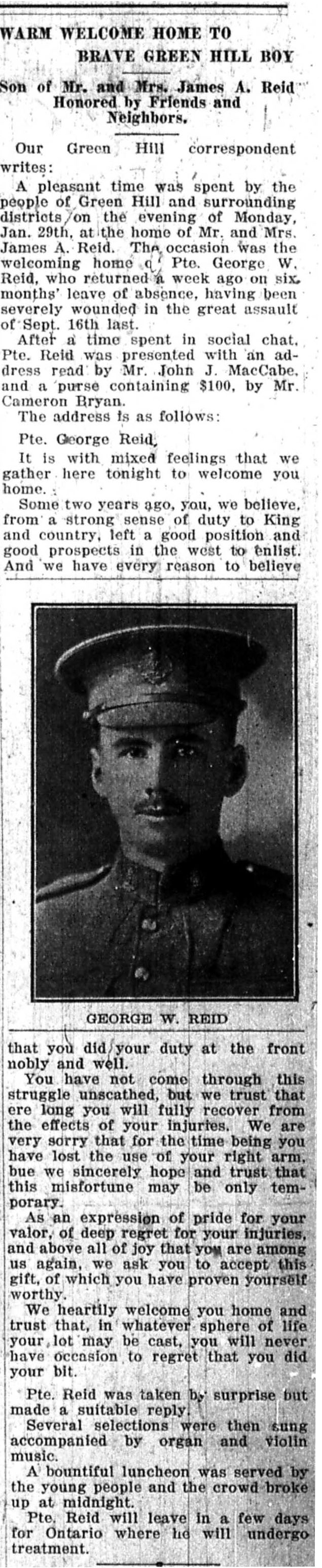 | Tags: | Battle of Flers-Courcelette, Courcelette France, WW1, George W Reid, Green Hill, Pictou, James A Reid, Private George W Reid, wounded soldier, Pte. Reid, Ontario, veteran, WWI veteran |