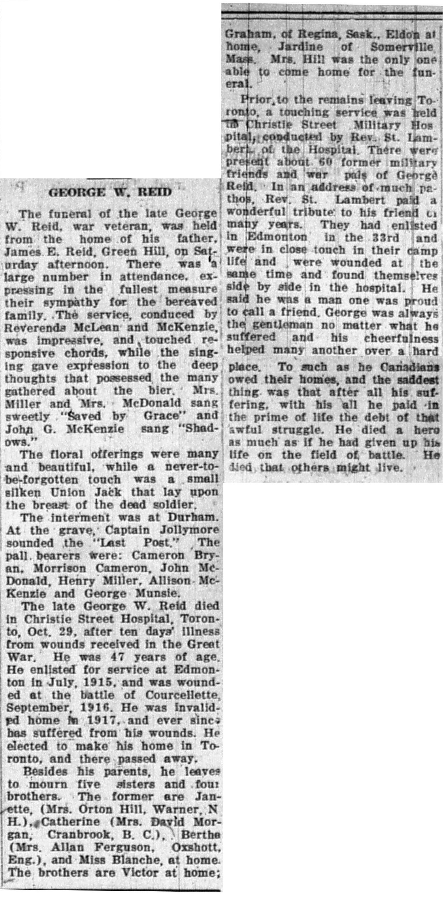 Prior to the remains leaving Toronto, a touching service was held in Christie Street Military Hospital, conducted by Rev. St. Lambert of the Hospital. There were present about 60 former military friends and war pals of George Reid. In an address to mcuh pathos, Rev. St. Lambert paid a wonderful tribute to his friend of many years. They had enlisted in Edmonton in the 33rd and were in close touch in their camp life and were wounded at the same time and found themselves side by side in the hospital. He said he was a man one was proud to call a friend. George was always the gentleman no matter what he suffered and his cheerfulness helped many another over a hard place. To such as he Canadians owed their homes, and the saddest thing was that after all his suffering, with his all he paid in the prime of life the debt of that awful struggle. He died a hero as much as if he had given up his life on the field of battle. He died that others might live.