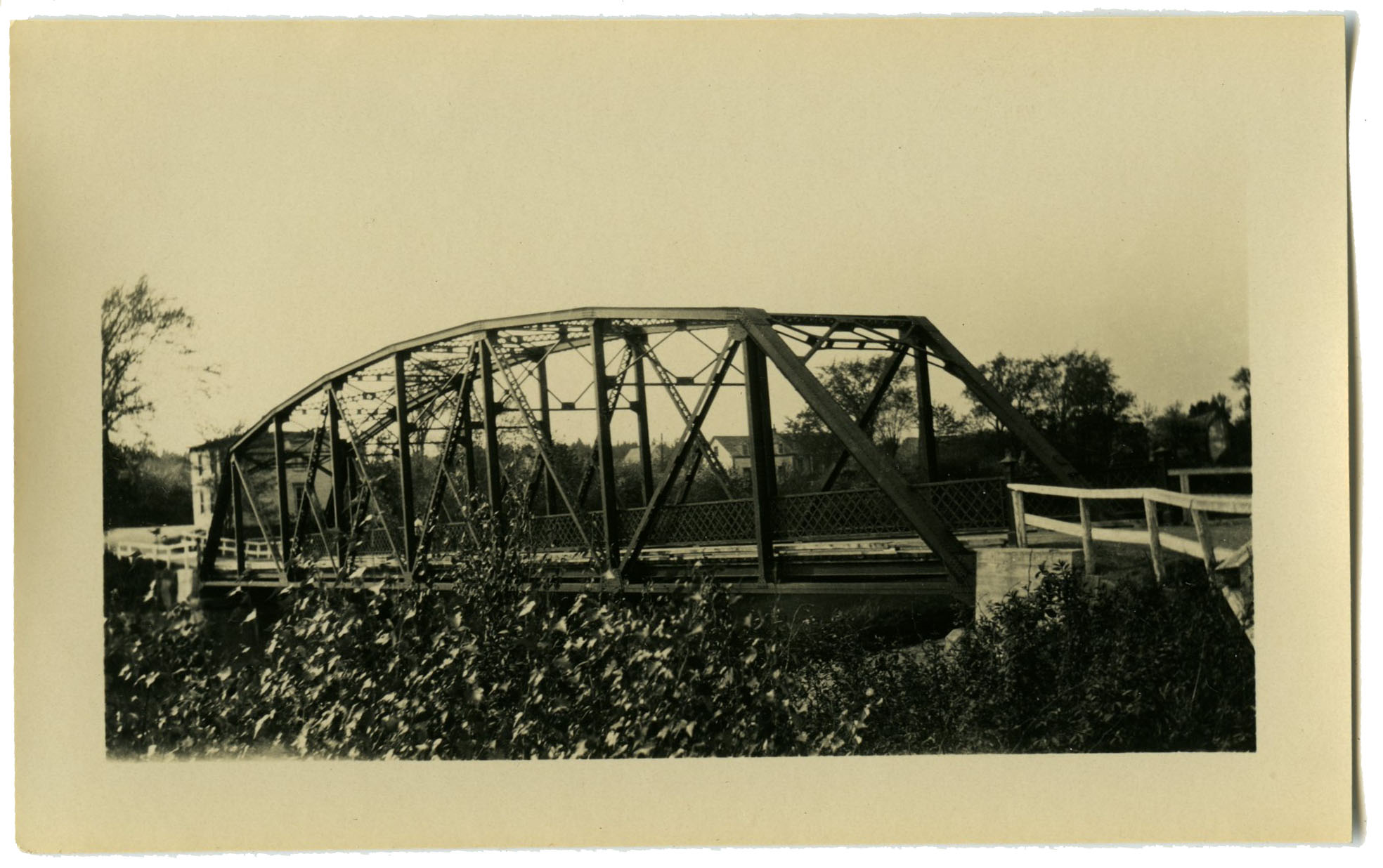 A steel, single lane bridge once crossed the West River in Durham. The photo was taken in 1930. The story and a half home of Alexander Cameron can be seen through the bridge. Cameron was the Durham postmaster and is listed as such in the Meacham 1879 Atlas. The large four square on the corner is also in the 1879 atlas and is the property of Isaac McLean, merchant.