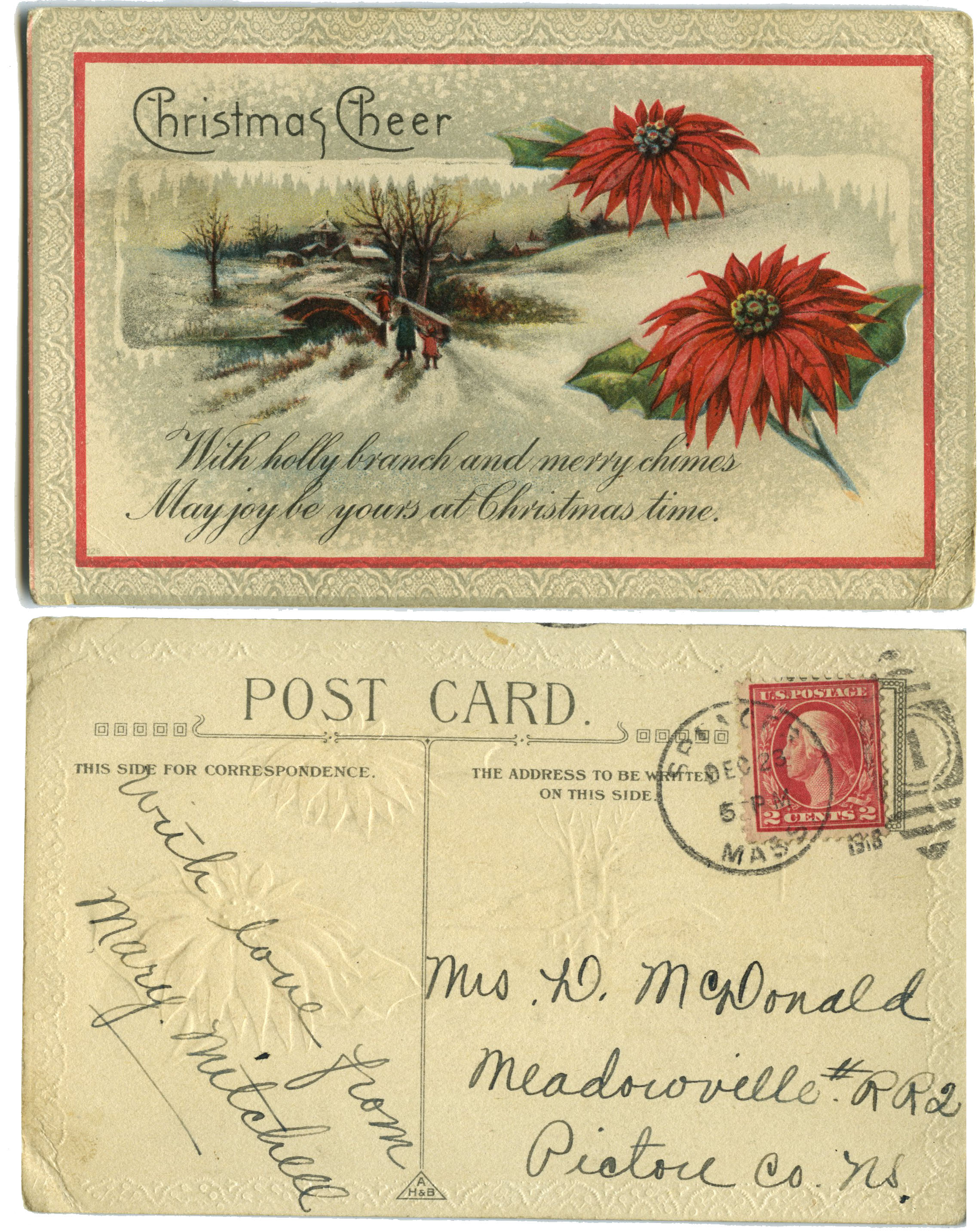 | Tags: | , Clara MacDonald, Mrs Daniel MacDonald, Mary Mitchell, Spencer, Massachusetts, 1918, Meadowville, Pictou, A Daniel MacDonald, Mrs Clara MacDonald, Christmas card, Clara Clark MacDonald, Poplar Hill, Alexander Daniel MacDonald, Seafoam |