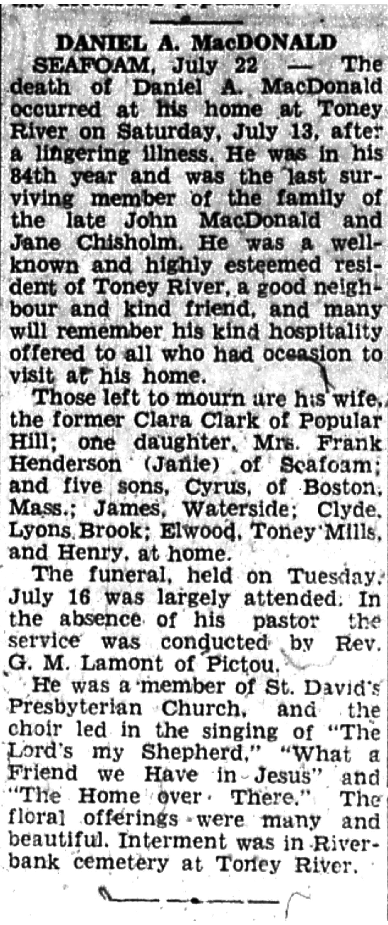 Seafoam, July 22 - The death of Daniel A. MacDonald occurred at his home at Toney River on Saturday, July 13, after a lingering illness. He was in his 84th year and was the last surviving member of the family of the late John MacDonald and Jane Chisholm. He was a well known and highly esteemed resident of Toney River, a good neighbour and a kind friend, and many will remember his kind hospitality offered to all who had occasion to visit at his home.