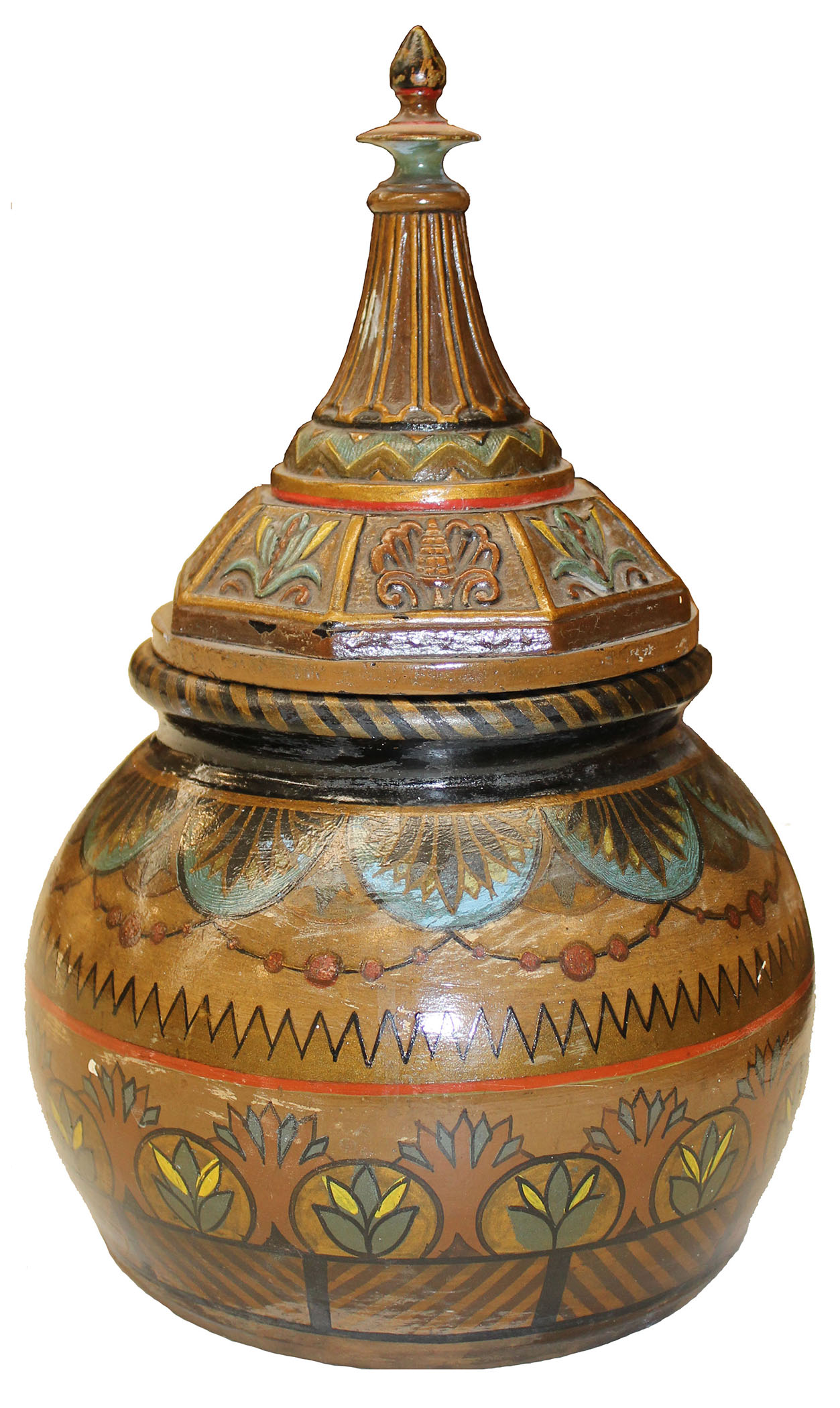 Clay urn with lid, painted by Charles C MacKenzie of Lyons Brook