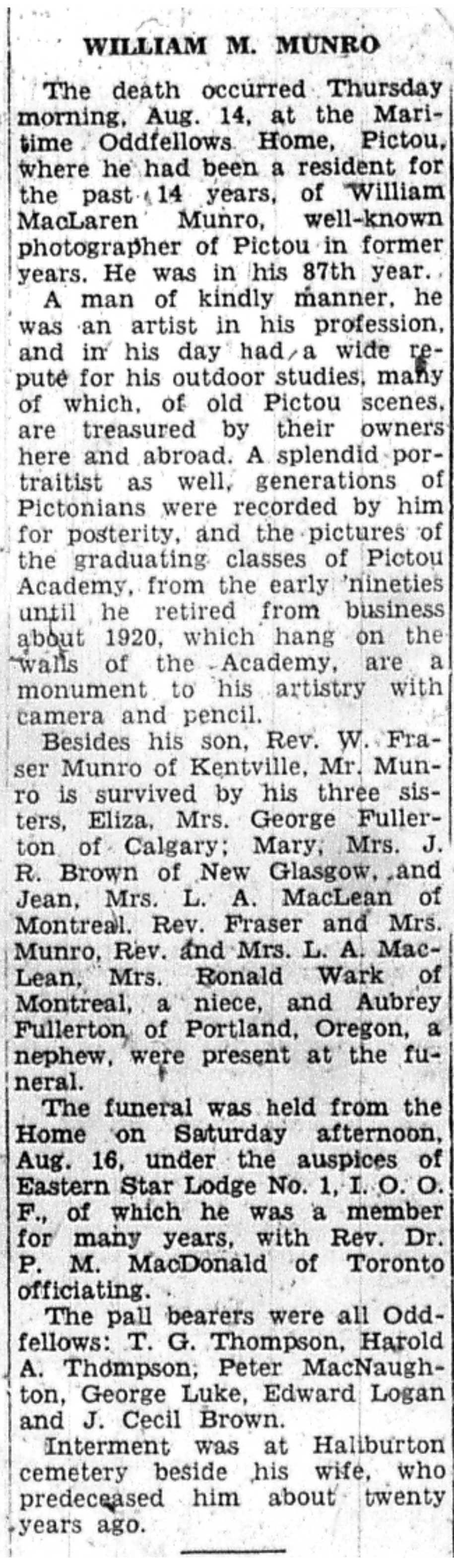 The death occurred Thursday morning, Aug 14 at the Maritime Oddfellows Home, Pictou, where he had been a resident for the past 14 years, of William MacLaren Munro, well-known photographer of Pictou in former years. He was in his 87th year.