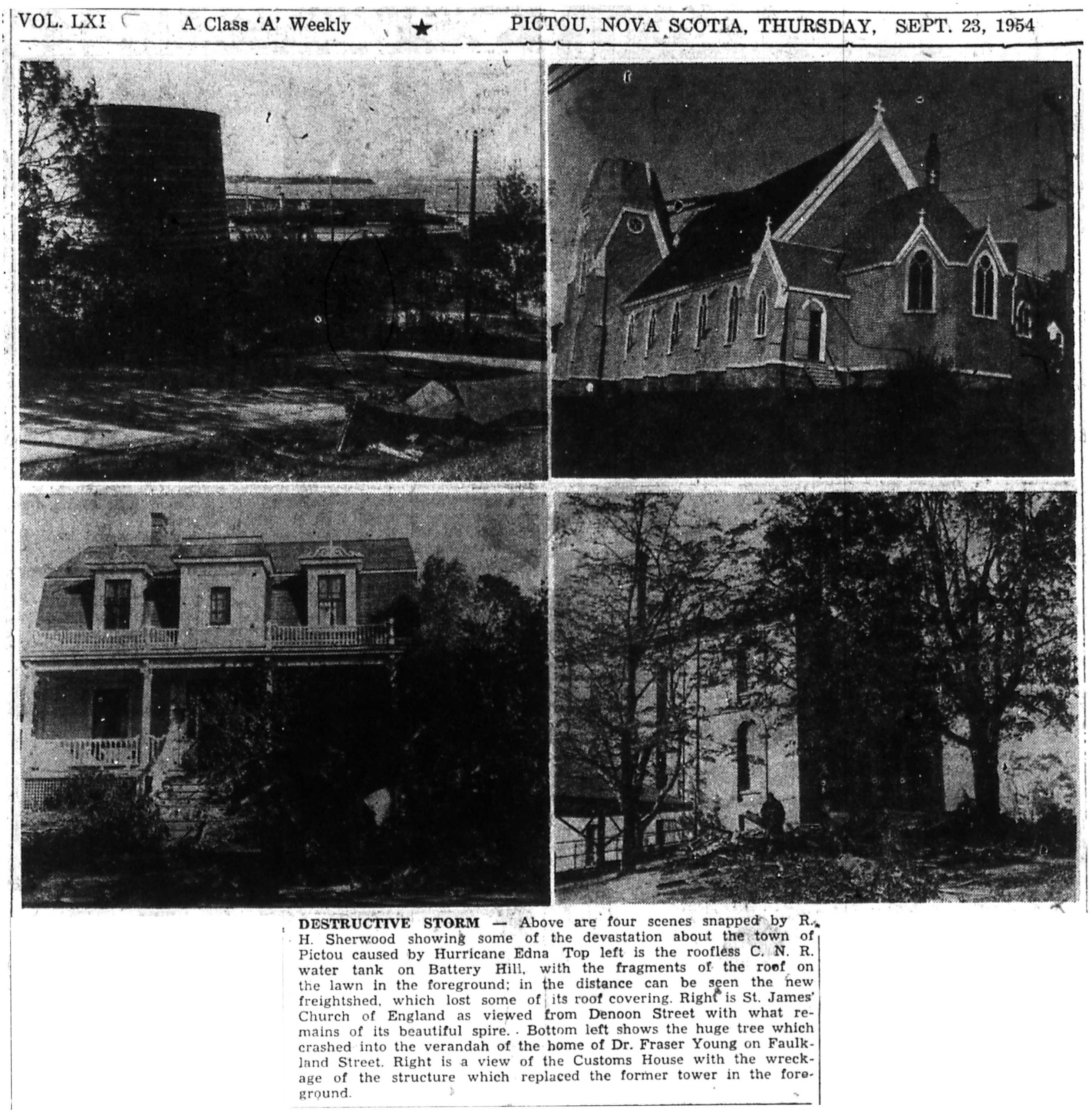 | Tags: | Roland H Sherwood, Pictou Advocate, Hurricane Edna, 1954, Customs House, St. James Church, CNR water tower, damage |