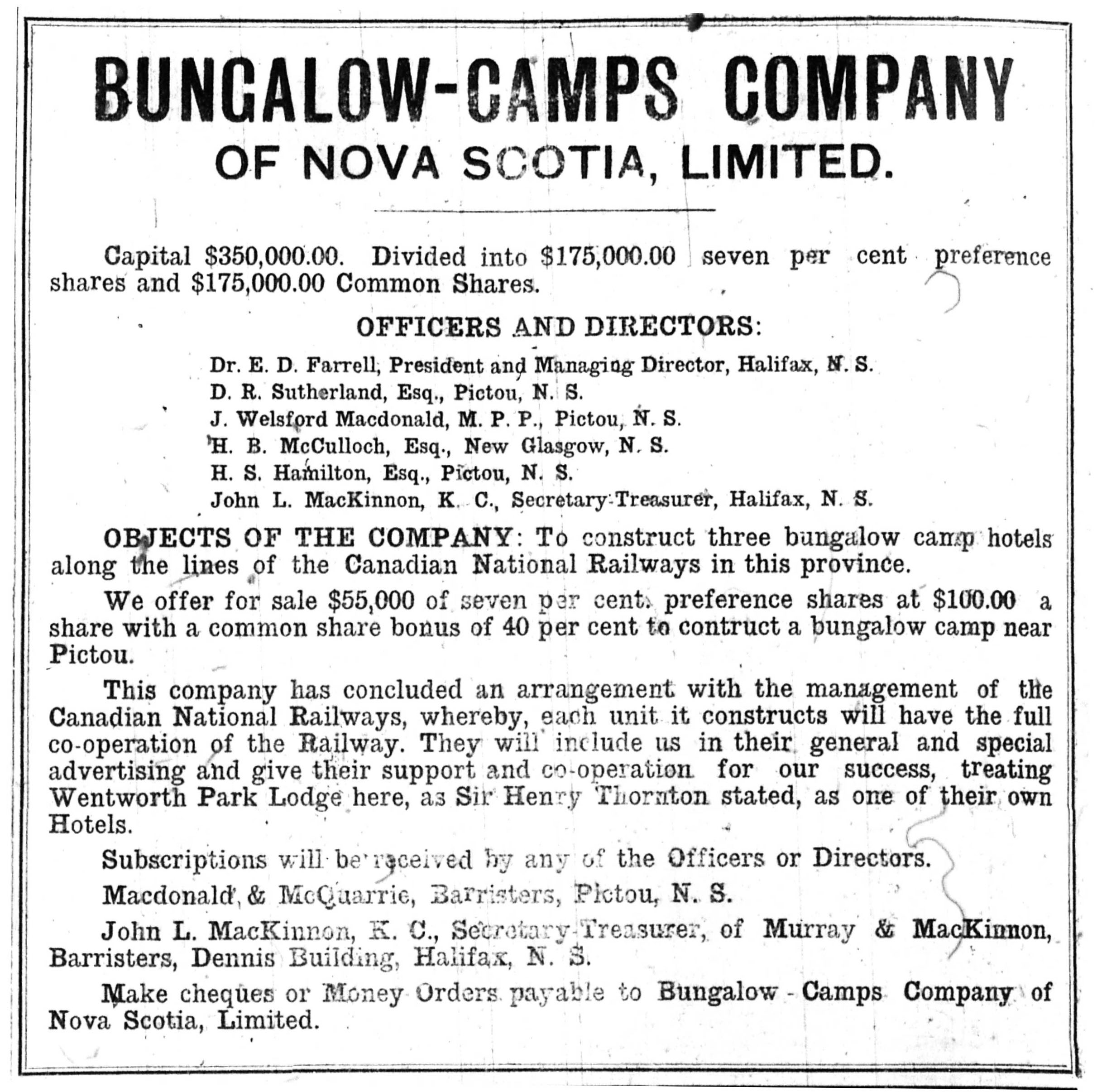 | Tags: | Wentworth Park Lodge, Pictou Lodge, Pictou, Bay View, 1924, tourism, tourists, Dr. E D Farrell, D R Sutherland, J Welsford Macdonald, H B McCulloch, H S Hamilton, John L MacKinnon, summer resort, Bungalow Camps, Braeshore |