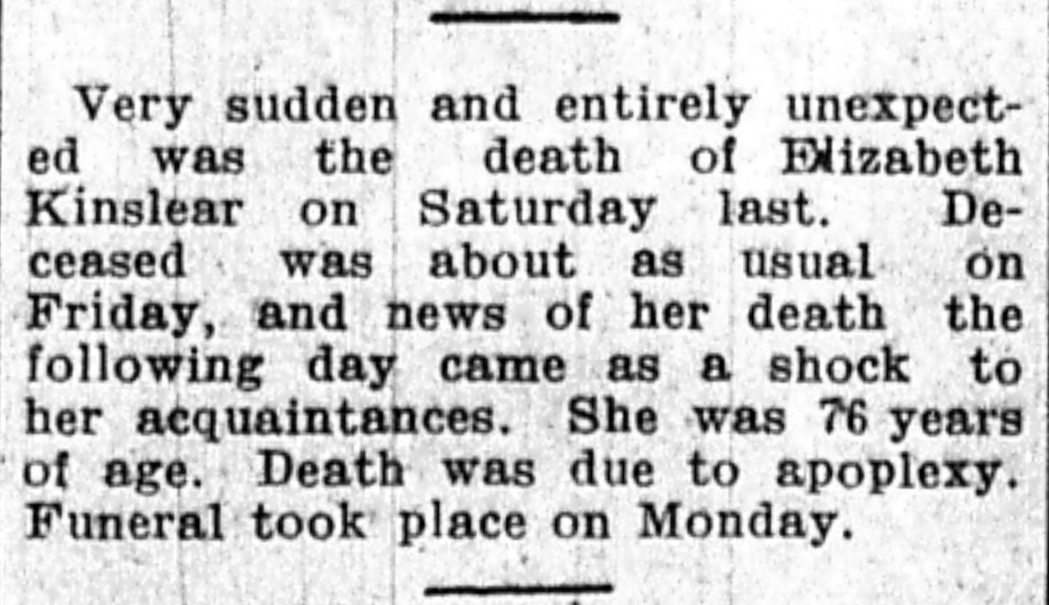 Elizabeth (Lizzie) Kinslear was born on Prince Edward Island about 1834. Her parents were from Ireland. She lived with her daughters Mary and Jane on Water Street in Pictou.