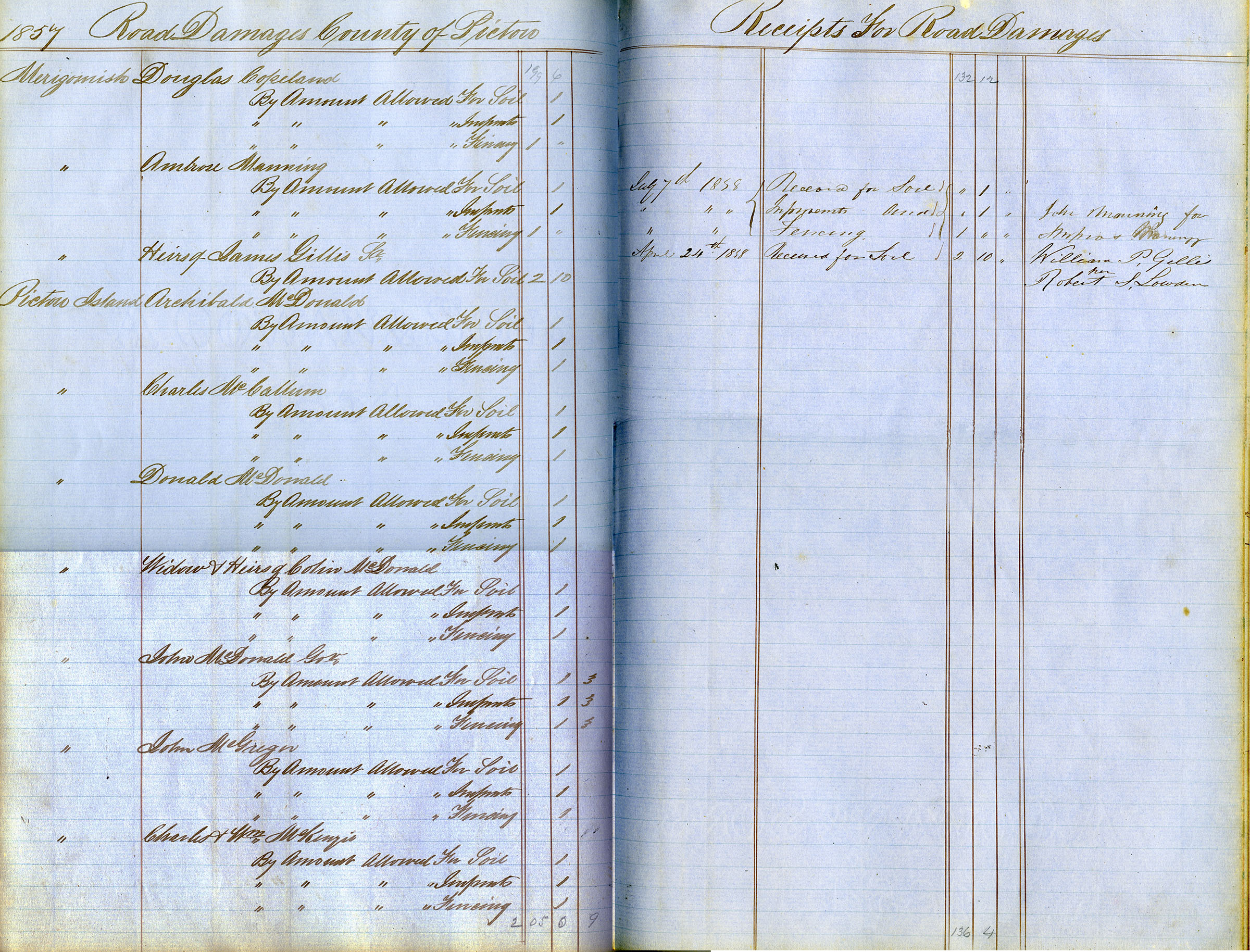 | Tags: | Douglas Copeland, Ambrose Manning, James Gillis, Heirs of James Gillis Senior, Archibald McDonald, Charles McCallum, Donald McDonald, Colin McDonald, Widow of Colin McDonald, Heirs of Colin McDonald, John McDonald, John McDonald Gov, John McGregor, Charles McKenzie, William McKenzie, John Manning, William P Gillis, Robert Lowden, road damages, road improvement, road maintenance, Pictou County roads, 1857, Merigomish, Pictou Island, fencing, 1858 |