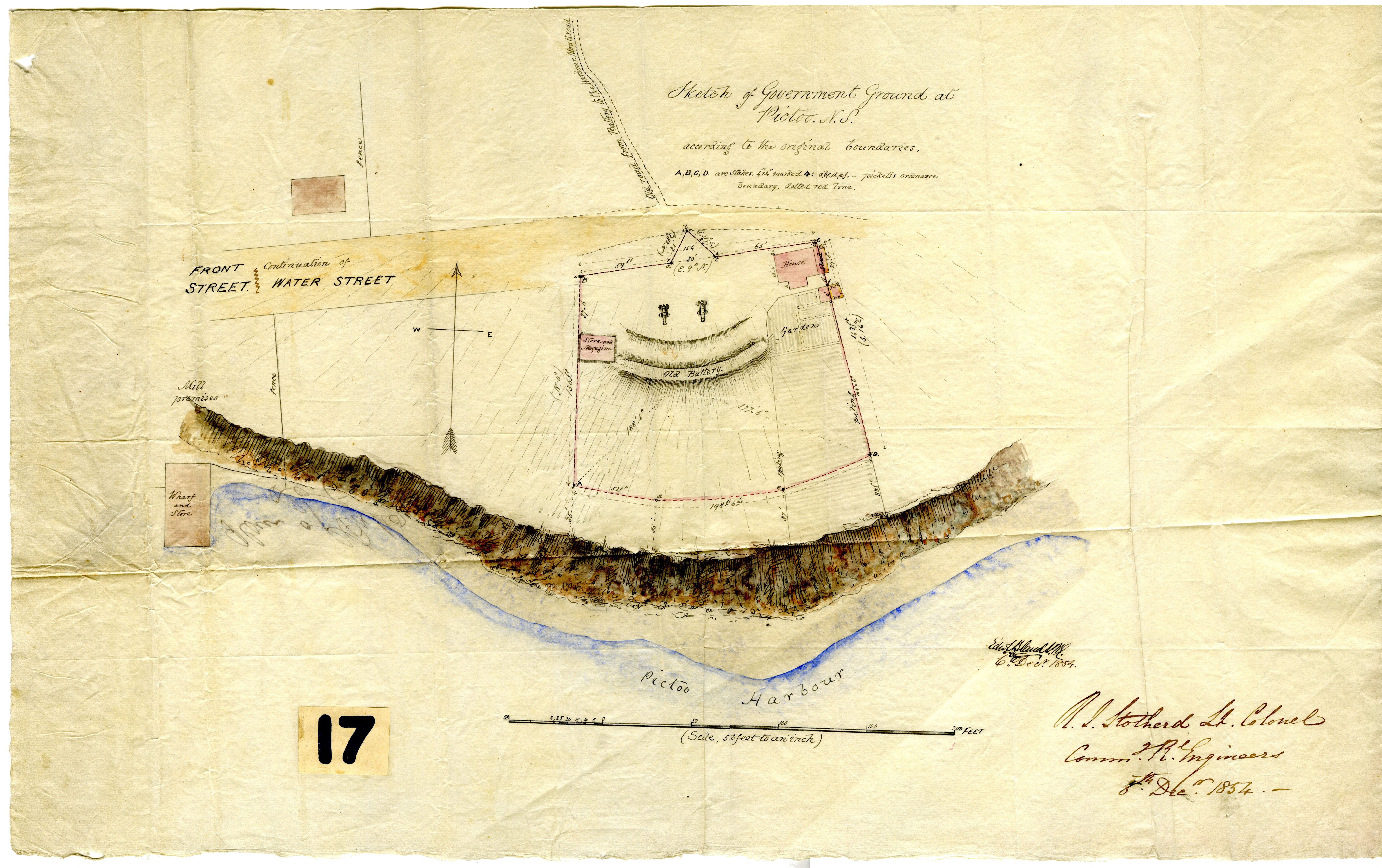 | Tags: | Battery Hill, Pictou town, 1854, Water Street, cannons, artillery, house, garden, Pictou harbour, magazine, wharf, store, map, plan, sketch, Government Ground, boundaries, Lieutenant Edward Bland, Royal Engineers, R J Stotherd Lieutenant Colonel |