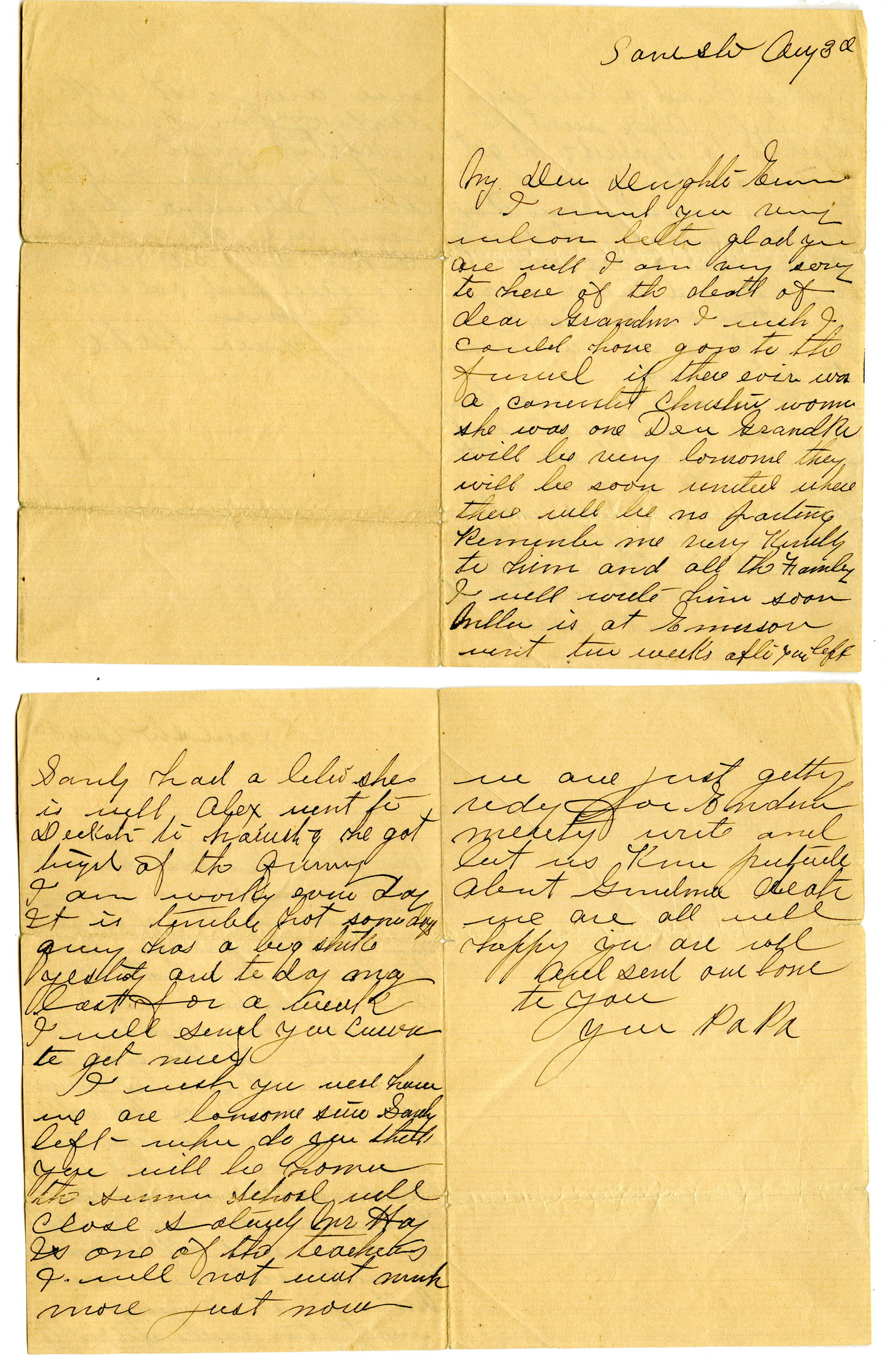 I wish you were home we are lonesome since Sandy left when do you think you will be home the summer school will close Saturday Mr [Hay] is one of the teachers I will not write much more just now we are just getting ready for E-- write and let us know [particularly] about Grandmas death we are all well happy you are well and send our love to you