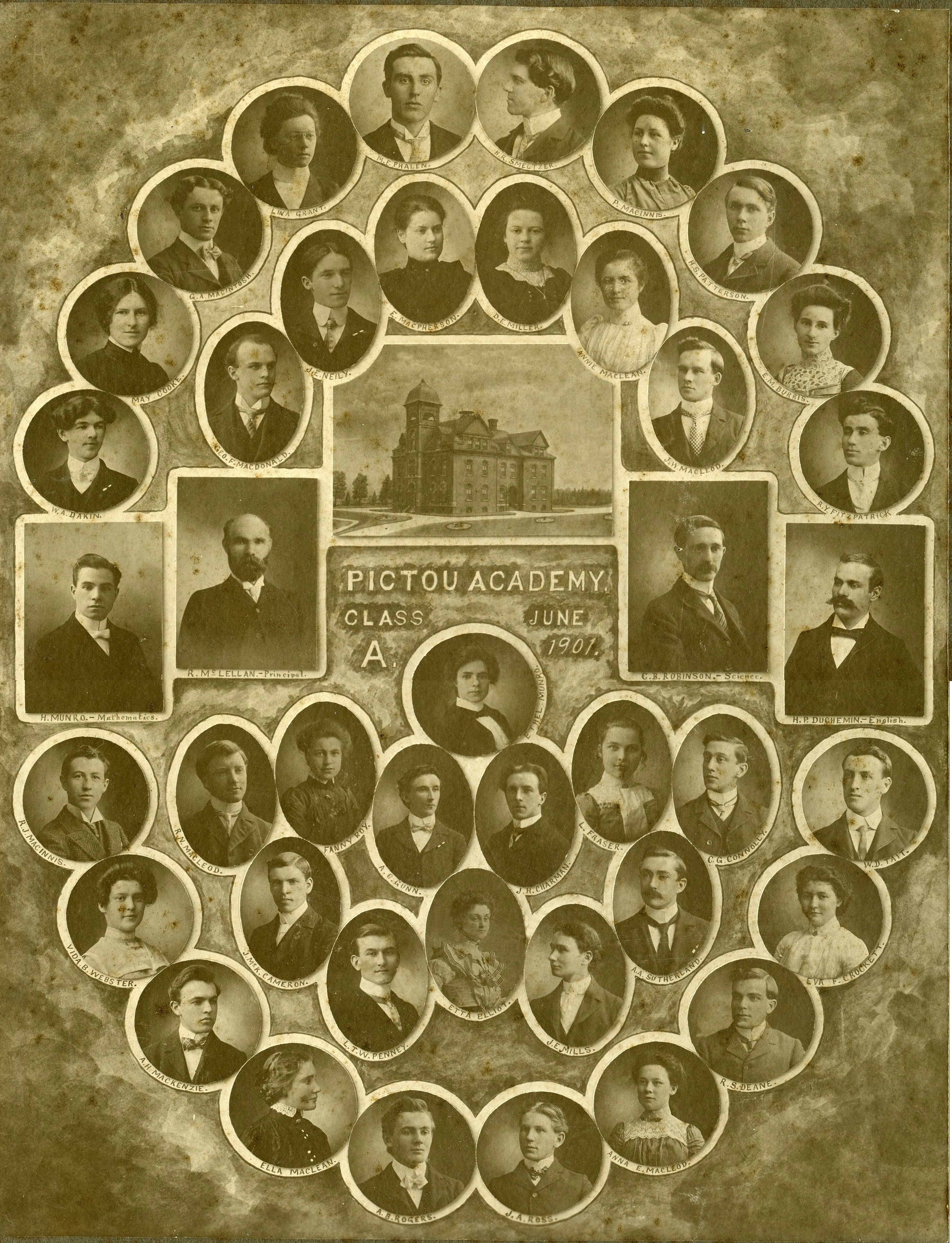 | Tags: | Pictou Academy, A class, June 1901, W.A. Dakin, May Cooke, G.A. MacIntosh, L.W.A. Grant, M.F. Phalen, H.R. Smeltzer, P. MacInnis, H.S. Patterson, E.M. Burris, R.Y. Fitzpatrick, J.W. MacLeod, Annie MacLean, D.E. Miller, E. MacPherson, J.E. Neily, Geo. F. MacDonald, R.J. MacInnis, Vida B. Webster, A.H. MacKenzie, Ella MacLean, A.B. Rogers, J.A. Ross, Anna E. MacLeod, R.S. Deane, Eva F. Crockett, W.D. Tait, C.G. Connolly, A.A. Sutherland, J.E. Mills, Etta Elliot, L.T.W. Penney, J. McK. Cameron, R.N. MacLeod, Fanny Roy, A. G. Gunn, J.H. Charman, L. Fraser, Ethel Munro, Teachers, H. Munro, R. McLellan, C.B. Robinson, H.P. Duchemin, Students |