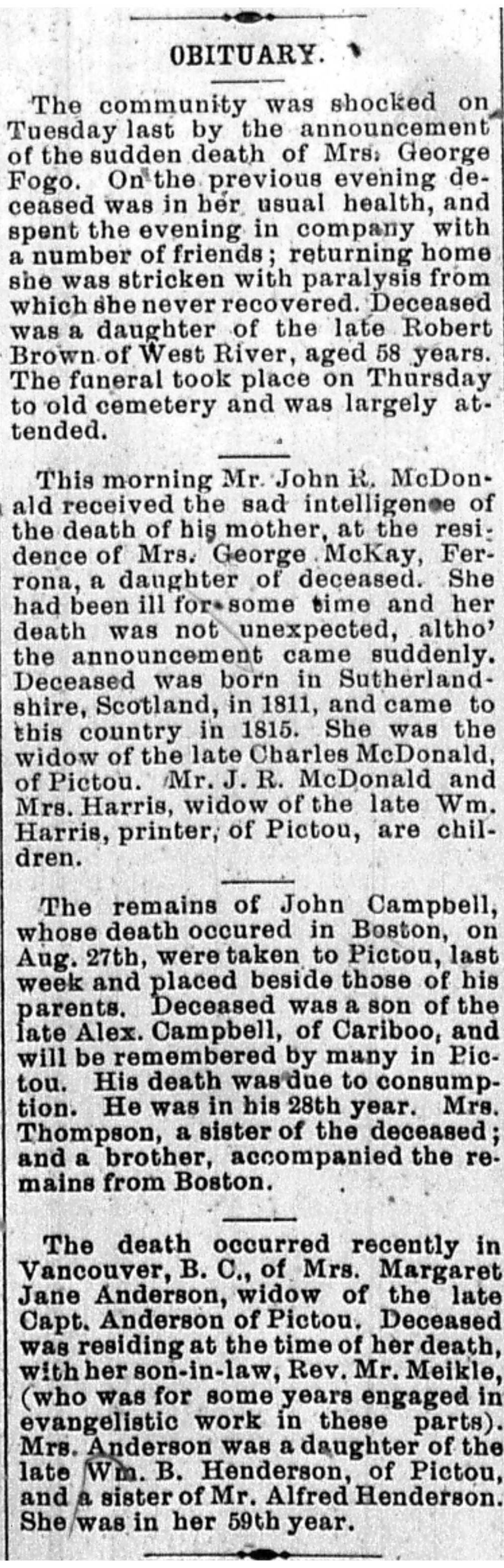 The community was shocked on Tuesday last by the announcement of the sudden death of Mrs. George Fogo. On the previous evening deceased was in her usual health, and spent the evening in company with a number of friends; returning home she was stricken with paralysis from which she never recovered. Deceased was a daughter of the late Robert Brown of West River, aged 58 years. The funeral took place on Thursday to old cemetery and was largely attended.