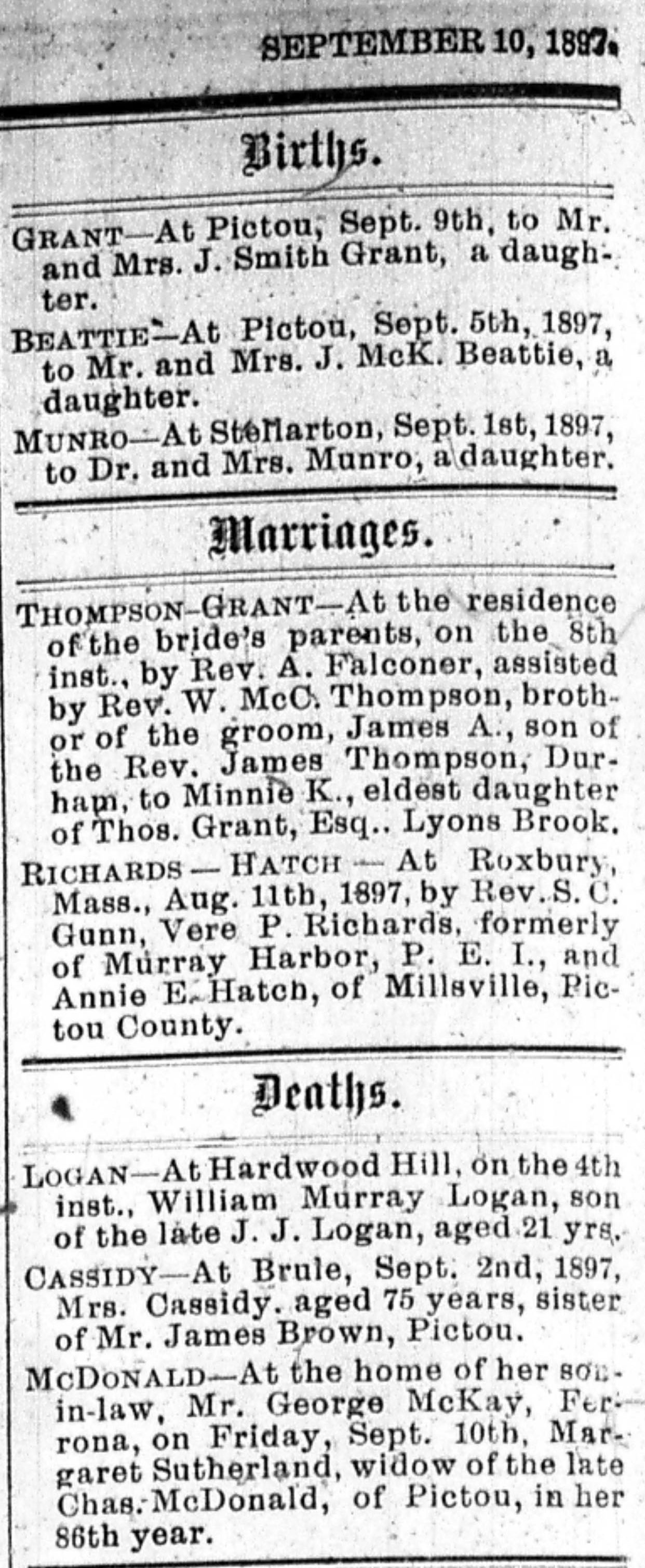 | Tags: | J Smith Grant, J McK Beattie, Dr Munro, Pictou, Stellarton, baby girl, September 1897, James A Thompson, Durham, Minnie K Grant, Minnie K Grant Thompson, Thomas Grant, Lyons Brook, Roxbury, Vere P Richards, Murray Harbor, Prince Edward Island, Annie E Hatch, Annie E Richards, Millsville, Pictou County, William Murray Logan, J J Logan, Mrs Cassidy, Mr James Brown, Margaret Sutherland McDonald, Charles McDonald, George McKay, Ferrona |