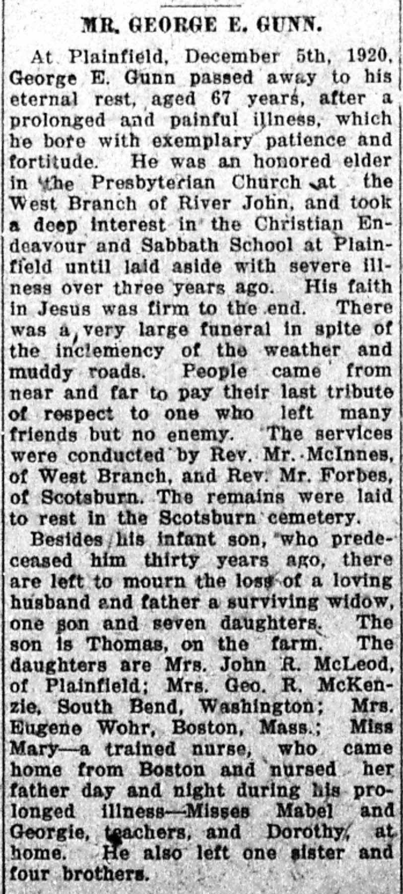 At Plainfield, December 5th, 1920, George E. Gunn passed away to his eternal rest, aged 67 years, after a prolonged and painful illness, which he bore with exemplary patience and fortitude. He was an honored elder in the Presbyterian Church at the West Branch of River John, and took a deep interest in the Christian Endeavour and Sabbath School at Plainfield until laid aside with severe illness over three years ago. His faith in Jesus was firm to the end. There was a very large funeral in spite of the inclemency of the weather and muddy roads. People came from near and far to pay their last tribute of respect to one who left many friends but no enemy. The services were conducted by Rev. Mr. McInnes, of West Branch, and Rev. Mr. Forbes, of Scotsburn. The remains were laid to rest in the Scotsburn cemetery.
