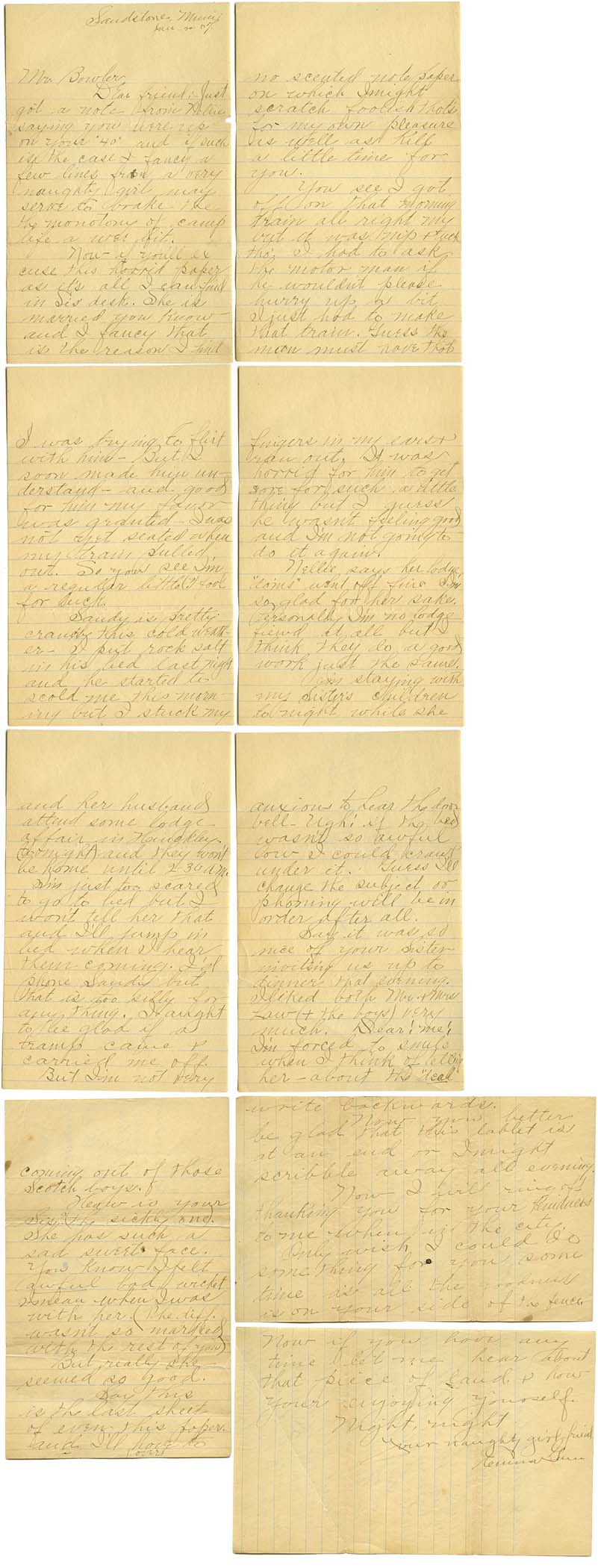 Dear friend: Just got a note from Nellie saying you were up on your "40" and if such is the case I fancy a few lines from a very naughty girl may serve to brake the monotony of camp life a wee bit.