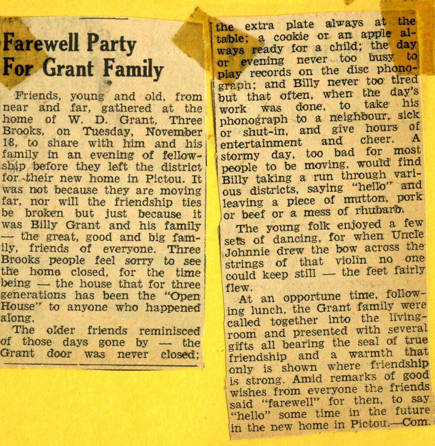 An an opportune time, following lunch, the Grant family were called together into the living room and presented with several gifts all bearing the seal of true friendship and a warmth that only is shown where friendship is strong. Amid remarks of good wishes from everyone the friends said "farewell" for then, to say "hello" some time in the future in the new home in Pictou. — Com.