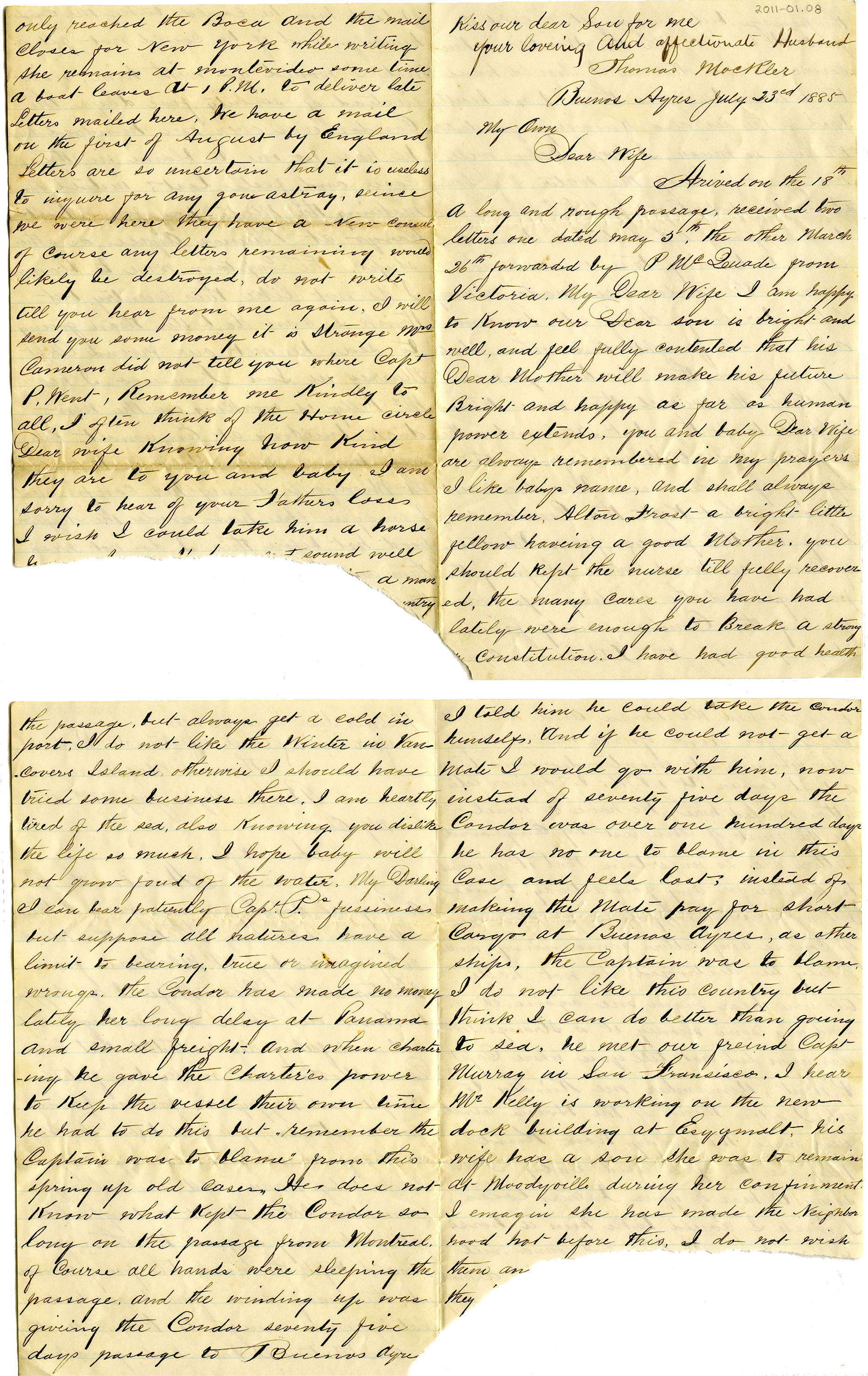 the passage, but always get a cold in port. I do not like the winter in Vancouvers Island, otherwise I should have tired some business there. I am heartly tired of the sea, also knowing you dislike the life so much. I hope baby will not grow fond of the water, My Darling I can bear patiently Capt. Ps. fussiness but suppose all natures have a limit to bearing, true or imagined wrongs. The Condor has made no money lately her long delay at Panama and small freight and when chartering he gave the charter's power to keep the vessel their own time he had to do this but remember the Captian was to blame from this spring up old cases. He does not know what kept the Condor so long on the passage from Montreal. Of course all hands were sleeping the passage and the winding up was giving the Condor seventy five days passage to Buenos Ayres