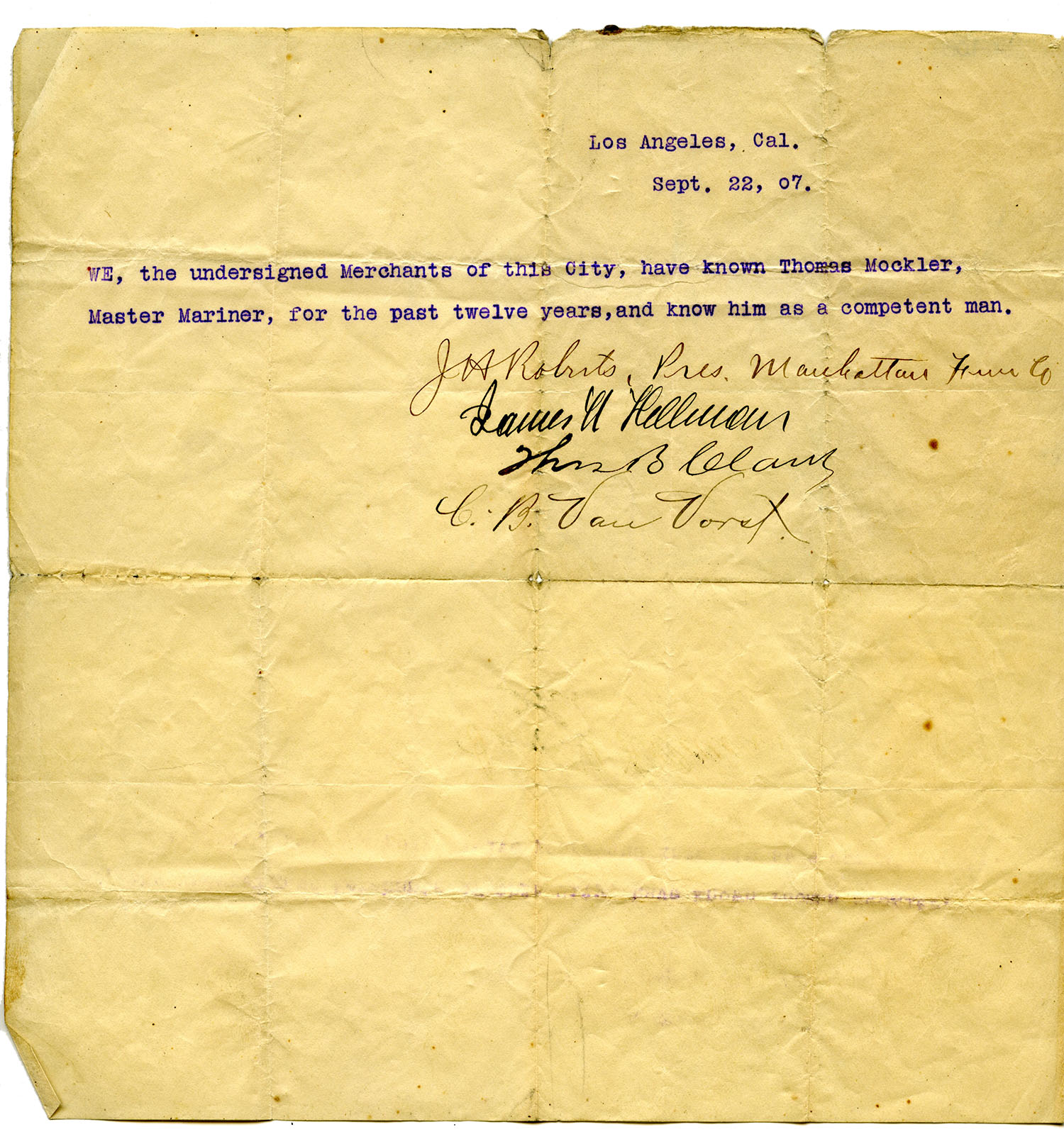 Letter of recommendation signed by 4 merchants of Los Angeles for Captain Thomas Mockler.