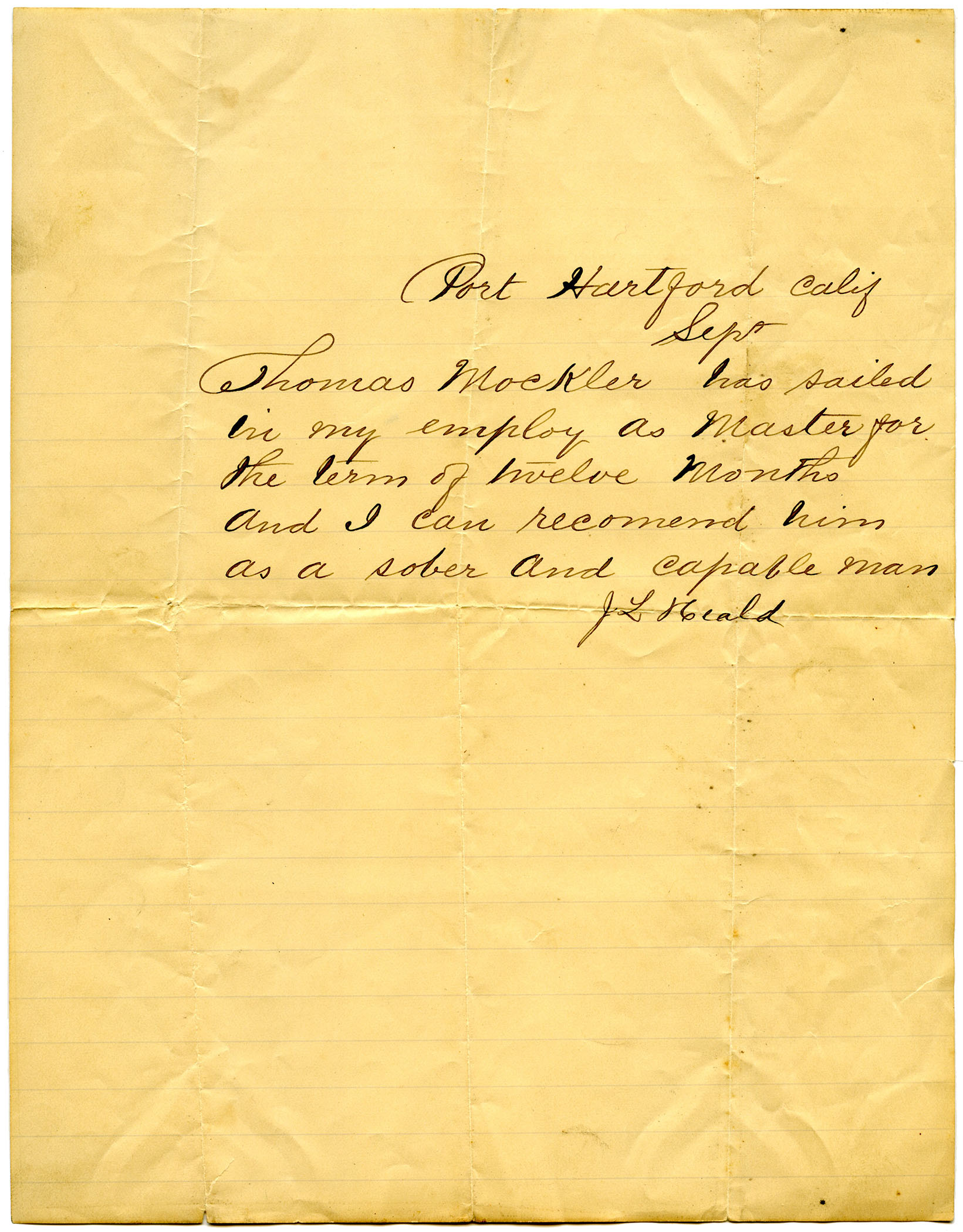 Recommendation letter for Thomas Mockler written by J L Heald, Port Hartford, California