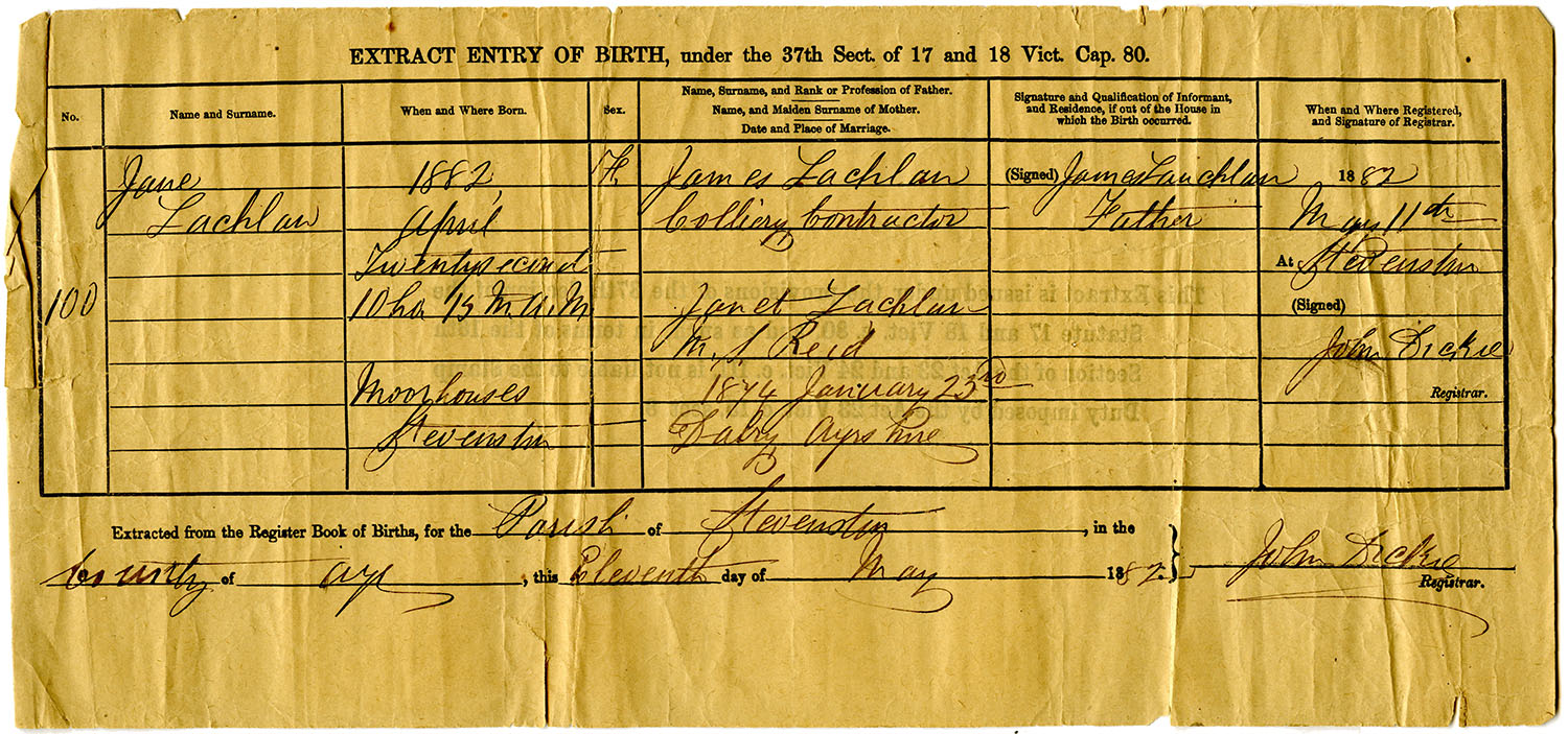 Extracted from the Register Book of Births, for the Parish of Stevenston, in the County of Ayr, this Eleventh day of May 1882.} John Dickie, Registrar.