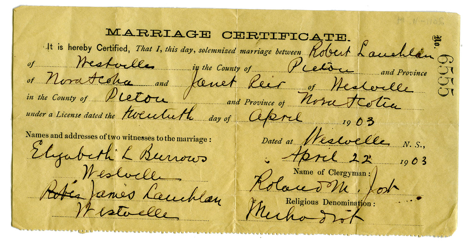 It is hereby Certified, That I, this day, solemized marriage between Robert Lauchlan of Westville in the County of Pictou and Province of Nova Scotia and Janet Reid of Westville in the County of Pictou and Province of Nova Scotia under a License dated the twentieth day of April 1903