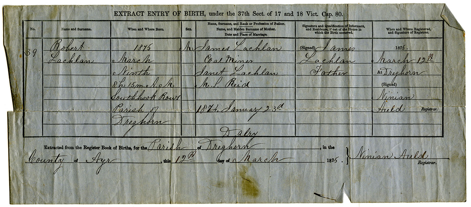 Extracted from the Register Book of Births, for the Parish of Dreghorn, in the County of Ayr, this 12th day of March 1875.} Ninian Auld, Registrar.