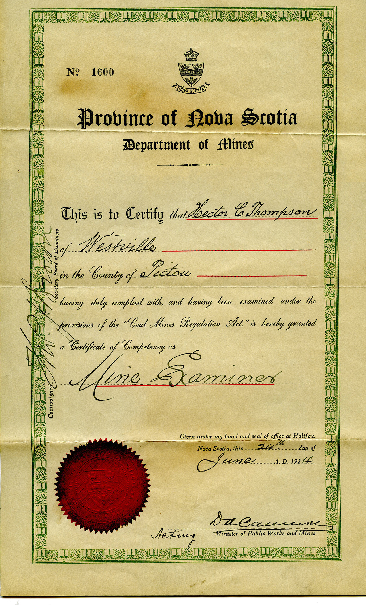 This is to Certify that Hector C Thompson of Westville in the County of Pictou having duly complied with, and having been examined under the provisions of the "Coal Mines Regulation Act," is hereby granted a Certificate of Competency as Mine Examiner