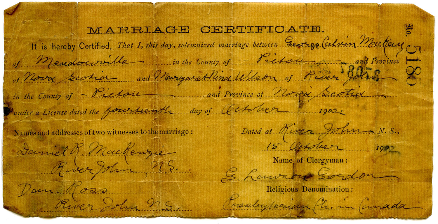 It is hereby Certified, That I, this day, solemized marriage between George Calvin MacKay of Meadowville in the County of Pictou and Province of Nova Scotia and Margaret Nina Wilson of River John in the County of Pictou and Province of Nova Scotia under a License dated the fourteenth day of October 1902.