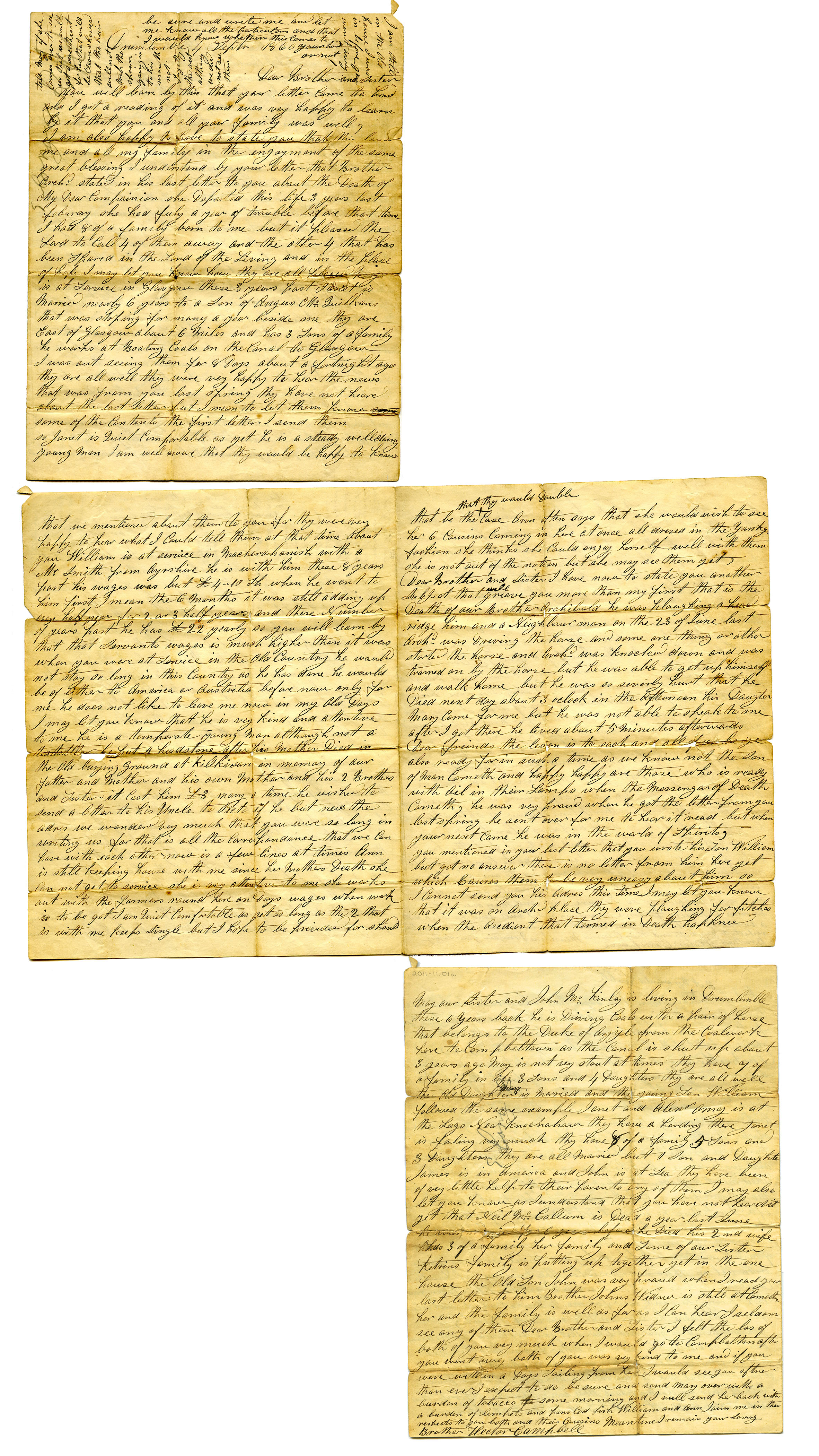 May our Sister and John Mc Kinlay is living in Drumlemble these 6 years back he is Driving Coals with a pair of horse that belongs to the Duke of Argyle from the Coalwork here to Campbeltown as the canal is shut up about 3 years ago May is not very stout at times they have [of] of a family in life 3 Sons and 4 Daughters they are all wel the Old Daughter (Mary) is married and the young Son William followed the same example Janet and Alexr. Amy is at the Lags Near Knocknaha they have a hearding there Janet is faling very much they have 8 of a family 5 Sons and 3 Daughters they are all married but 1 Son and Daughter James is in America and John is at Sea they have been of very little help to their parents any of them I may also let you know as I understand that you have not heard it yet that Neil Mc Callum is Dead a year last June he was married for 6 years before he Died his 2nd wife has 3 of a family her family and some of our Sisters Ketrins family is putting up together yet in the one house The old Son John was very proud when I read your last letter to him Brother Johns Widow is still at Campbeltown her and the family is well as far as I can hear I seldom see any of them Dear Brother and Sister I felt the loss of both of you very much when I would go to the Campbeltown after you went away both of you was very kind to me and if you were within a days sailing from her I would see you oftenr than ever I expect to do be sure and send Mary over with a burden of tobacco to some morning and I will send ber back with a burden of lembets and pans Cod fish William and Ann joins me in their respects to you both and their Cousins Meantime I remain your Loving Brother Hector Campbell
