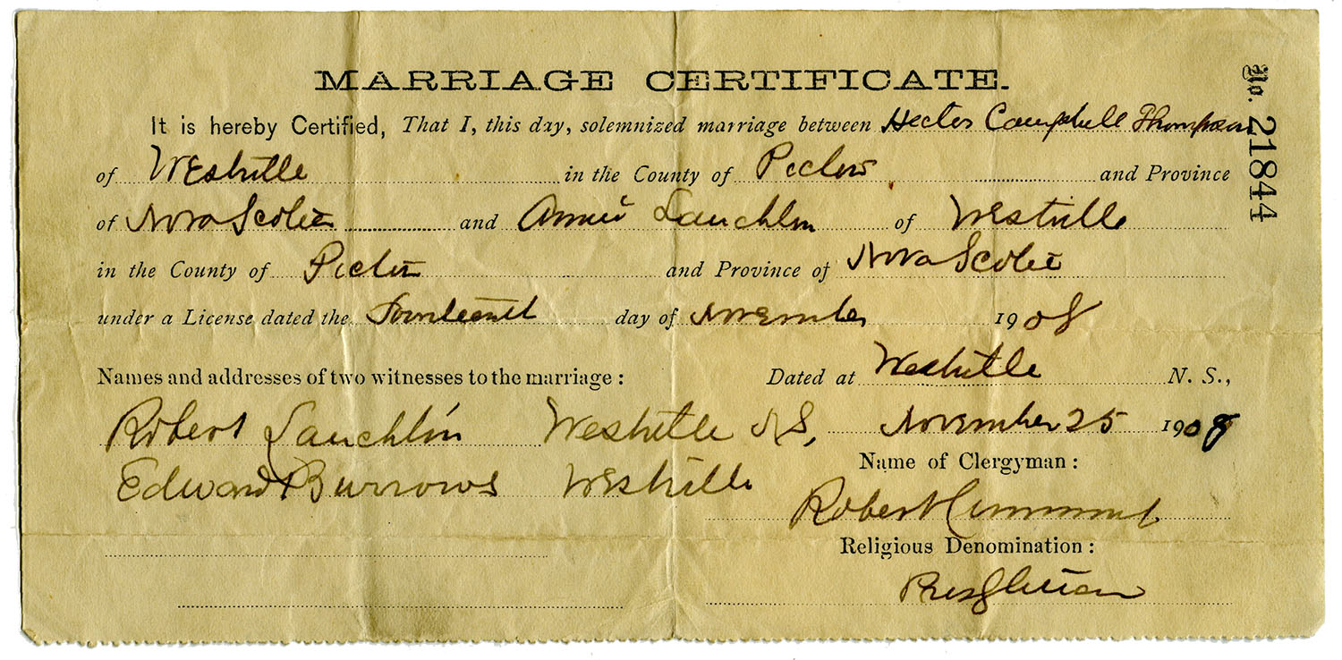 It is hereby Certified, That I, this day, solemized marriage between Hector Campbell Thompson of Westville in the County of Pictou and Province of Nova Scotia and Annie Lauchlan of Westville in the County of Pictou and Province of Nova Scotia under a License dated the fourteenth day or November 1908