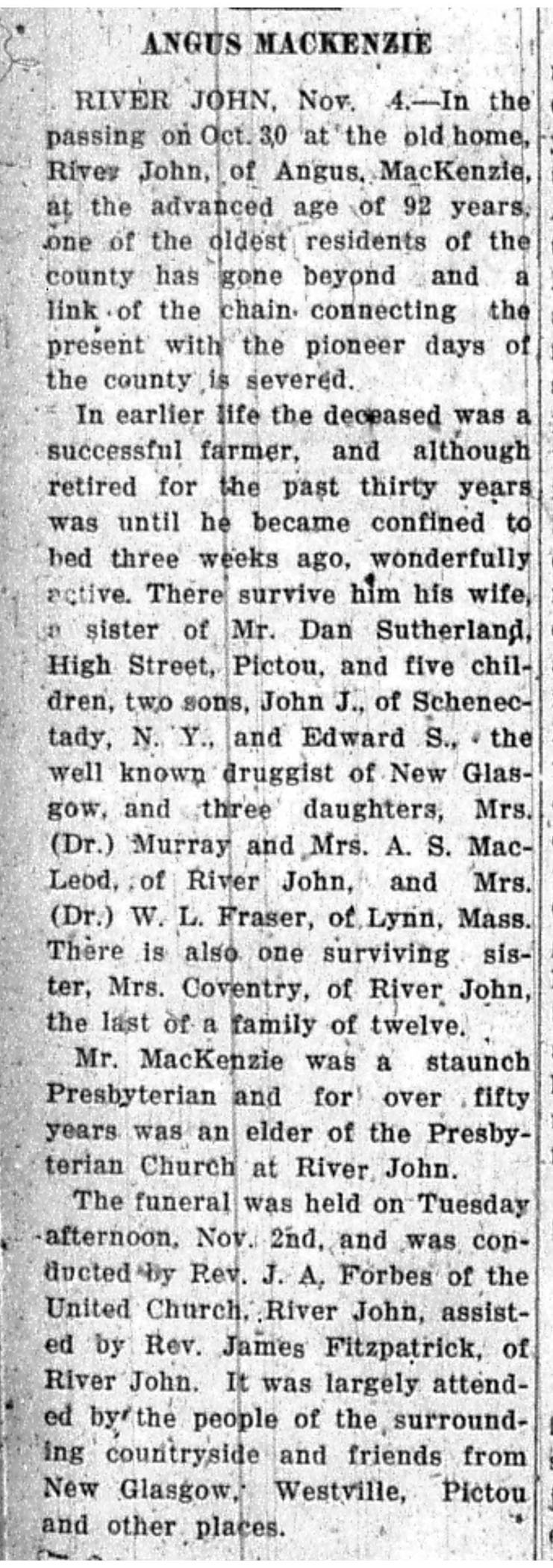 RIVER JOHN, Nov. 4 — In the passing on Oct. 30 at the old home, River John, of Angus MacKenzie, at the advanced age of 92 years, one of the oldest residents of the county has gone beyond and a link of the chain connecting the present with the pioneer days of the county is severed.