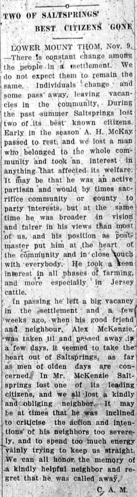 LOWER MOUNT THOM, Nov. 9 — There is constant change among the people in a settlement. We do not expect them to remain the same. Individuals change and some pass away, leaving vacancies in the community. During the past summer Saltsprings lost two fo its best known citizens. Early in the season A. H. McKay passed to rest and we lost a man who belonged to the whoe community and took an interest in anything that affected its welfare. It may be that he was an active partisan and would by times sacfifice community or county to party interests, but at the same time he was broader in vision and fairer in his views than most of us, and his position as postmaster put him at the heart of the community and in close touch with everybody. He took a keen interest in all phases of farming, and more especially in Jersey cattle.