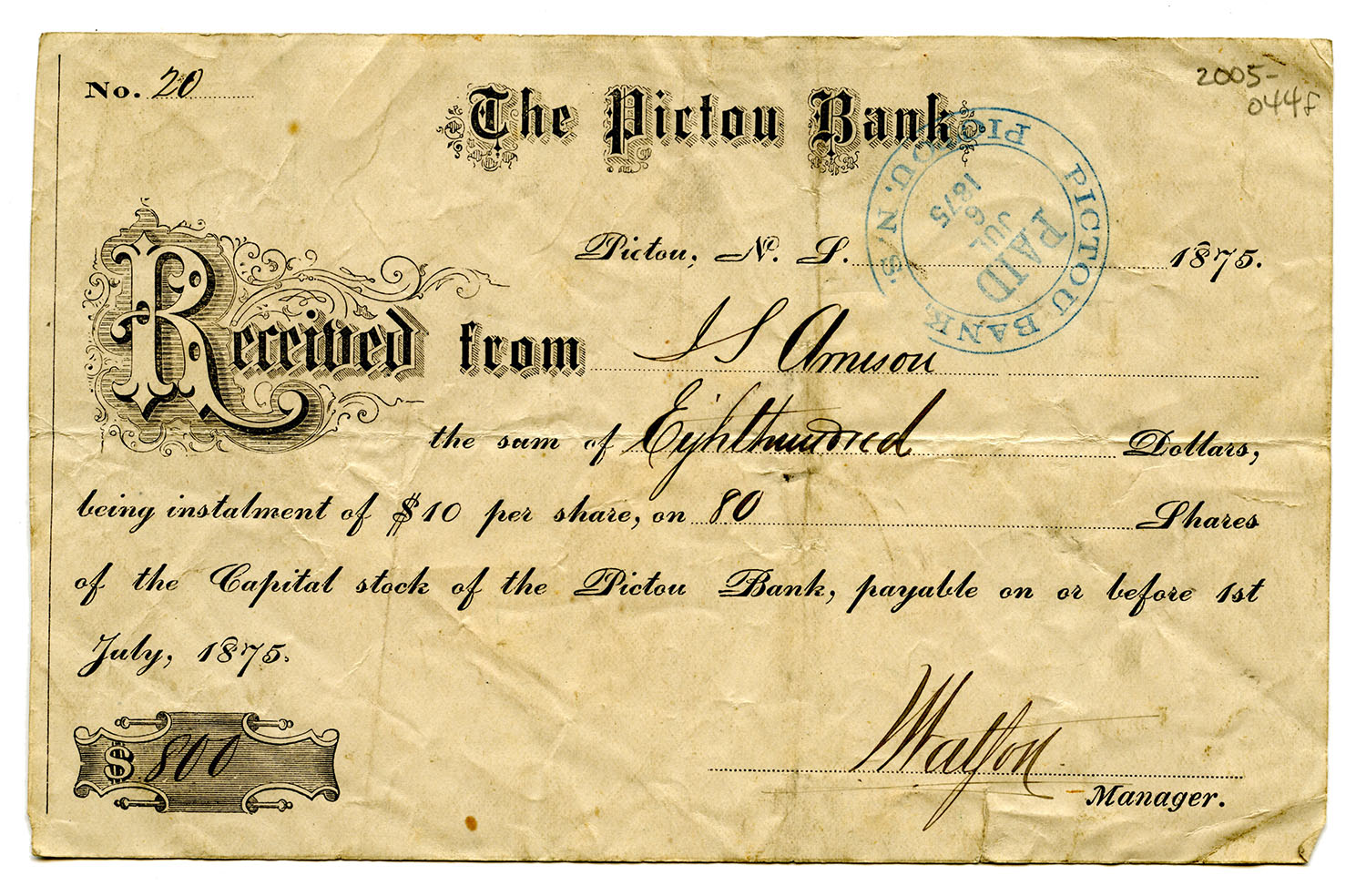 Receipt issued to J S Armison for eight hundred dollars for 80 shares of Pictou Bank stock for July 1875.