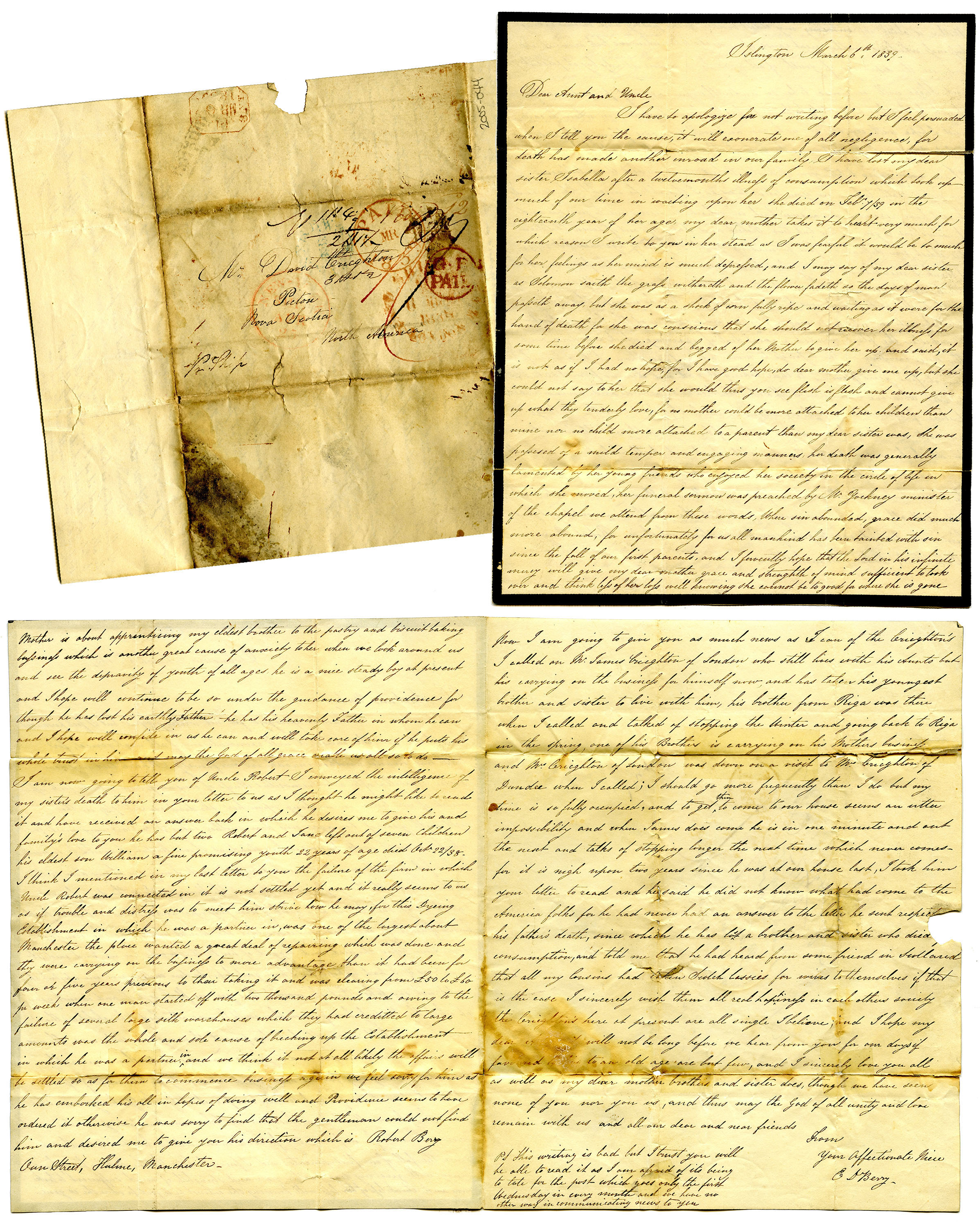Mother is about apprenticing my eldest brother to the pastry and biscuit baking business which is another great cause of anxiety to her when we look around us and see the depravity of youth of all ages he is a nice steady boy at present and I hope will continue to be so under the guidance of providence for though he has lost his earthly Father he has his heavenly Father in whom he can and I hope will confide in as he can and will take care of him if he put his whole trust in him and may the Good of all grace enable us all so so to do— I am now going to tell you of Uncle Robert I conveyed the intelligence of my sister's death to him in your letter to us as I thought he might like to read it and have received an answer back in which he desires me to give his and family's love to you he has but two Robert and Jane left and out of seven children his eldest son William a fine promising youth 22 years of age died Oct 22/38. I think I mentioned in my last letter to you that failure of the firm in which Uncle Robert was connected in it is not settled yet and it really seems to us as if trouble and distress was to meet him strive how he may, for this Dyeing Establishment in which he was a partner in, was one of the largest about Manchester the place wanted a great deal of repairing which was done and they were carrying on the business to more advantage than it had been for four or five years previous to their taking it and was clearing from £50 to £60 per week when one man started off with two thousand pounds and owing to the failure of several large silk warehouses which they had credited to large amounts was the whole and sole cause of breaking up the Establishment in which he was a partner in and we think it not all all likely the affairs will be settled so as for them to commence business again we feel sorry for him as he has embarked his all in hopes of doing well and Providence seems to have ordered it otherwise he was sorry to find that the gentleman could not find him and desired me to give you his direction which is Robert Berry, Oun Street, Hulme, Manchester