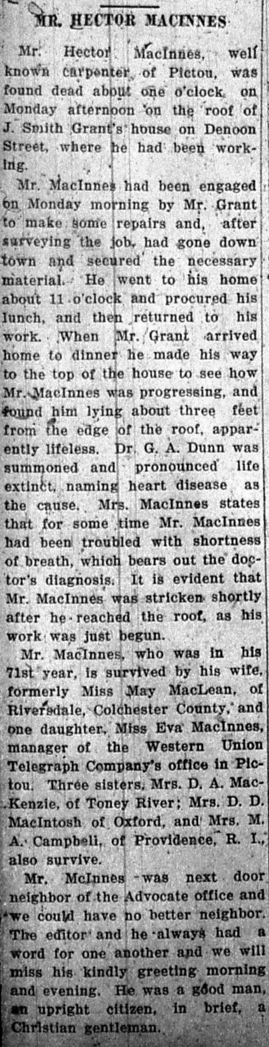Mr. Hector MacInnes, well known carpenter of Pictou, was found dead about one o'clock on Monday afternoon on the roof of J. Smith Grant's house on Denoon Street, where he had been working.