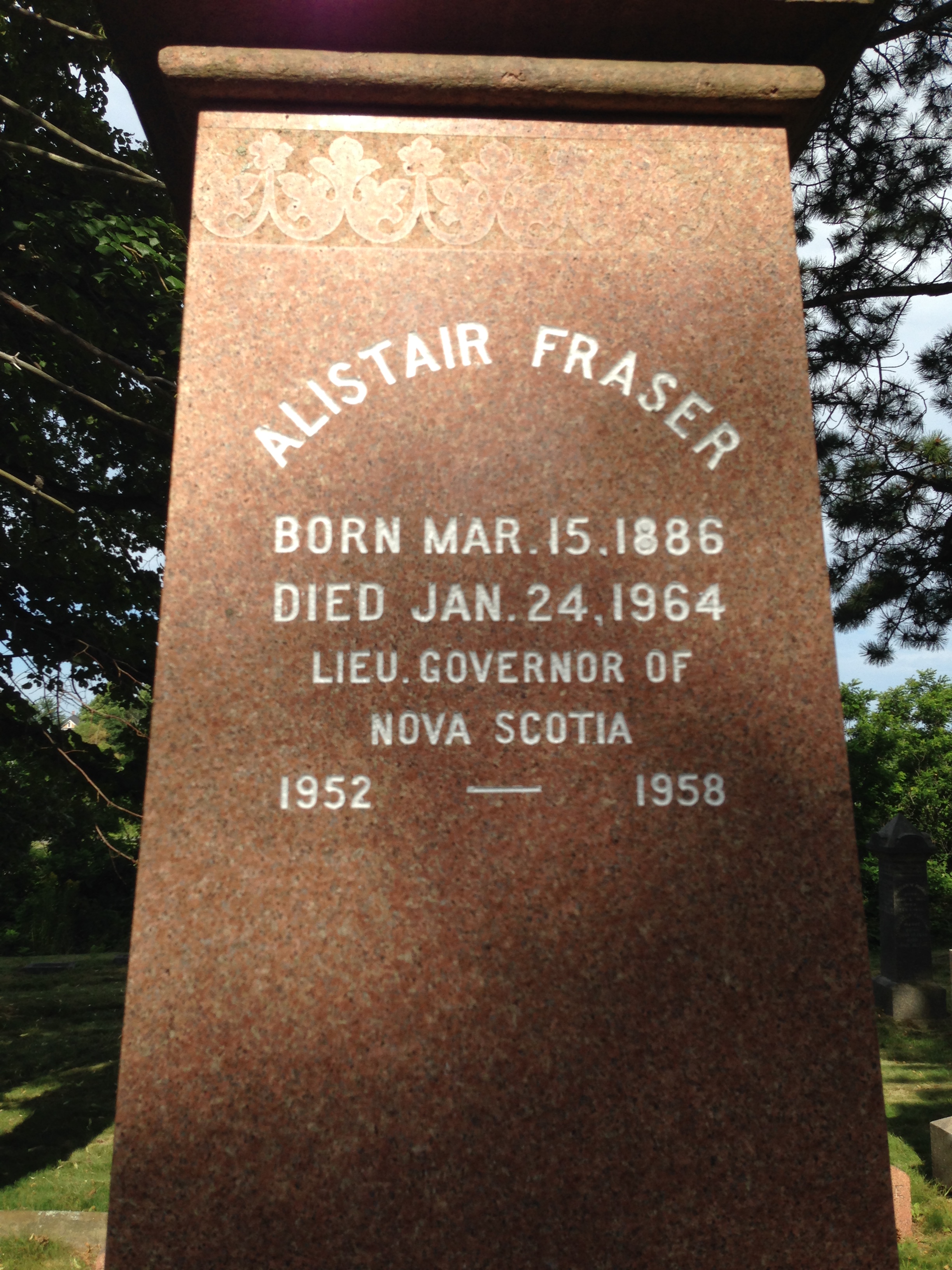 Gravestone of Alistair Fraser 1886 - 1964 of New Glasgow, Lieu. Governor of NS 1952-1958.